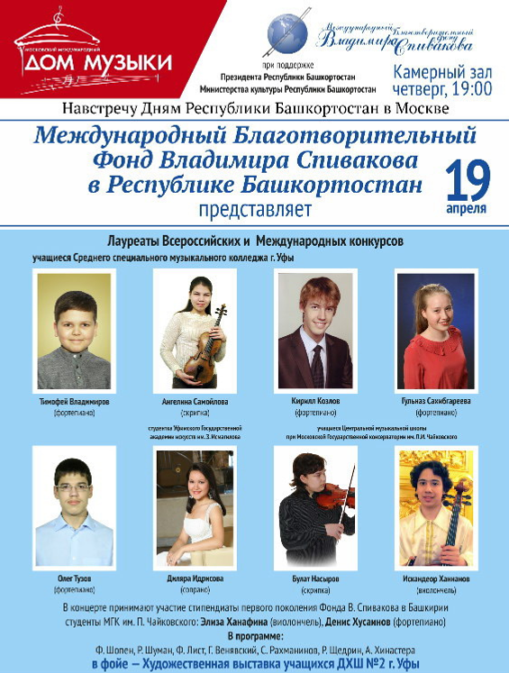 The show of the grant holders of Vladimir Spivakov’s international charity fund in Republic of Bashkortostan – students and graduates of the Ufa Arts College, Ufa State Academy of Arts by Zagir Ismagilov and pupils of the central musical school under the Moscow State Conservatory by P. I. Tchaikovsky will take place on April 19 in the chamber hall of the Moscow International Music House.