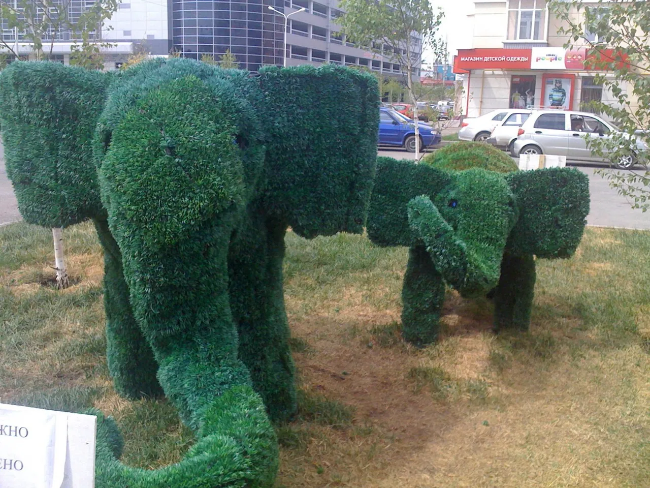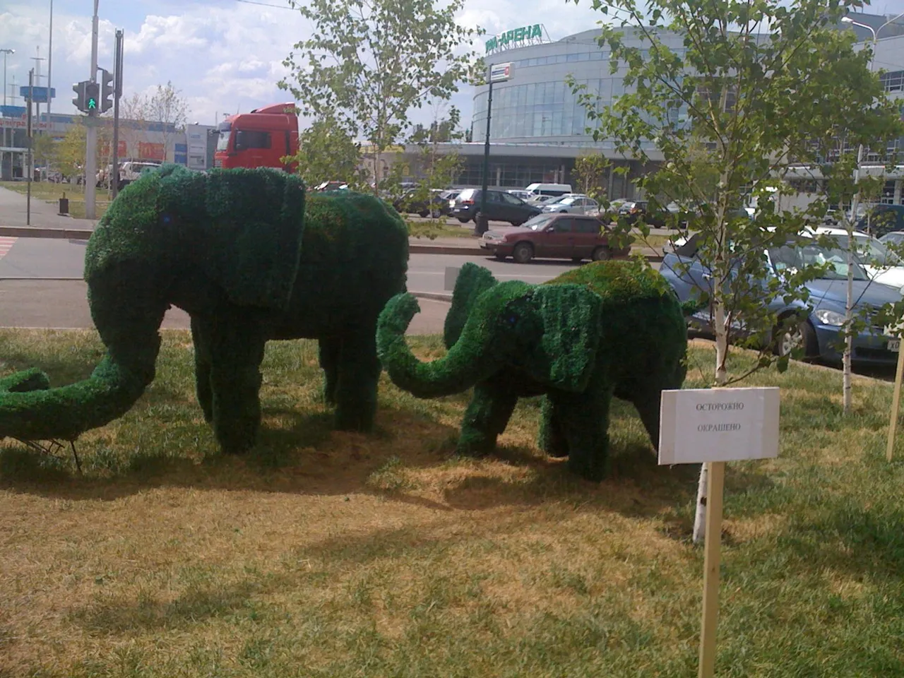 As the head of department of municipal services and accomplishment of the Soviet district of Ufa Midkhat Gilmutdinov told the Bashinform News Agency, it was Gorzelenhoz employees who established green elephants from metal structure in the square in front of "Ufa-Arena". They were made at the research-and-development shop of this enterprise. The territory near the elephants is laid out with roll out lawn.