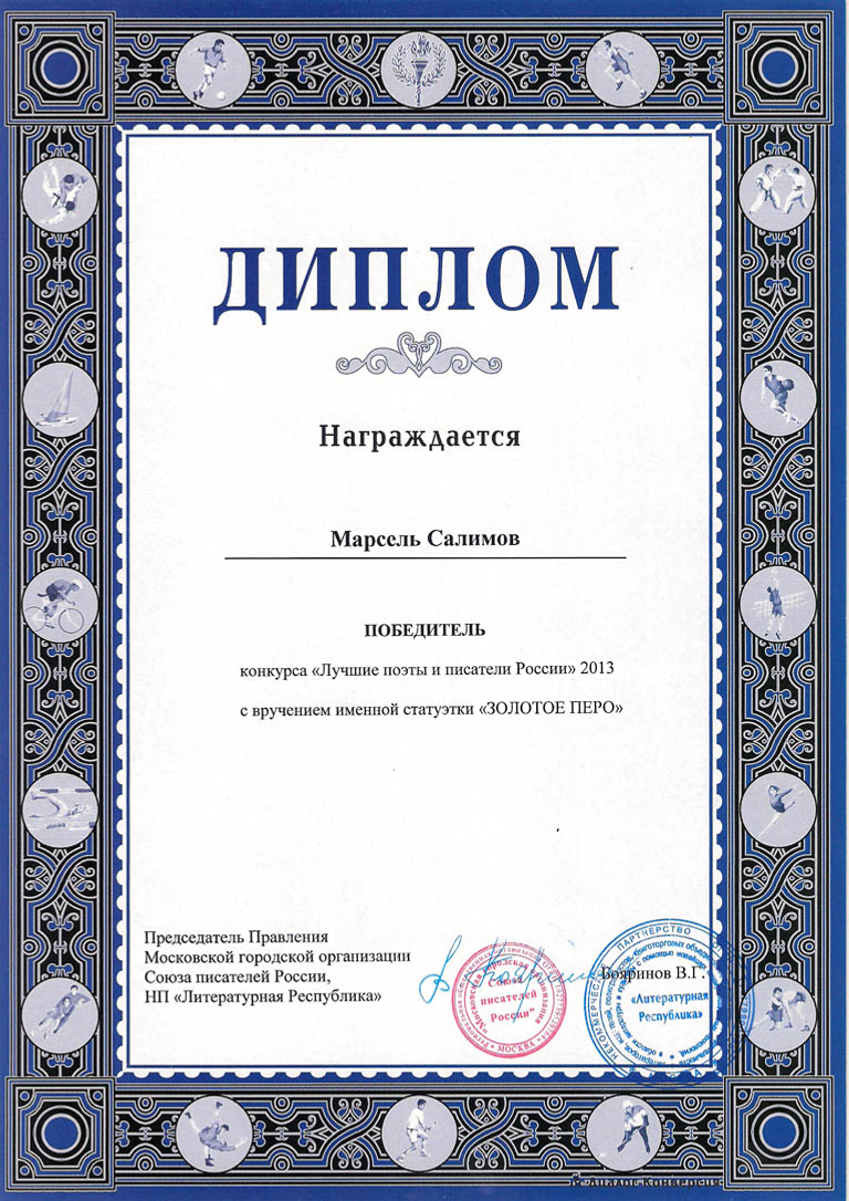 Sharp journalistic and satirical poems by Marsel Salimov were published in Moscow collections "Literary Heritage of Russia 2013", "The Best Russian Poets and Writers 2013", "Moya Rodina", etc. Articles about his works were published in the "Bulletin of the International Community of Writers Unions", magazines "Journalist", "Journalism and Media Market".