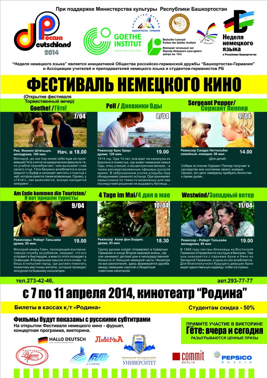 A German film festival will be held in Ufa from April 7 to 11. The film dedicated to the young age of the future writer Johann Wolfgang von Goethe will open the program. It is planned to show six films as a part of the festival in the "Rodina" cinema, the event organizer Gizella Bakaeva said.