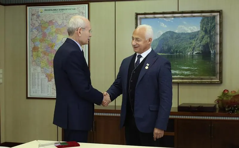 UFA, 15 October 2014. /Bashinform News Agency/. On October 14, in Ufa a meeting of the President of Bashkortostan Rustem Khamitov and the art director of the National Philharmonic Orchestra of Russia, the State Chamber Orchestra "Moscow Virtuosi", the President of Moscow International House of Music Vladimir Spivakov took place. As the press service of the head of the republic informs, during the meeting Rustem Khamitov handed over the maestro an award pin to the honourary title "People's Artist of Bashkortostan Republic".