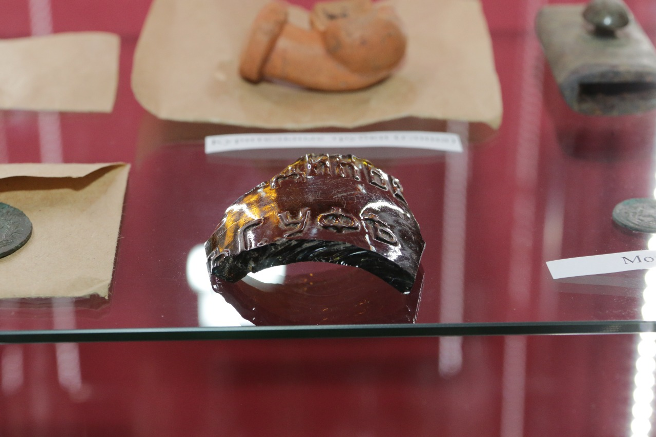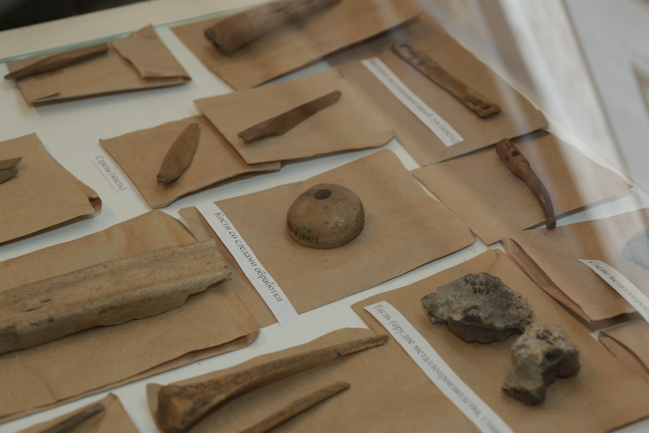 The exhibition features unique pieces - arrowheads, tableware, jewelry, stone sculpture of a human head and even a fragment of leather armour.