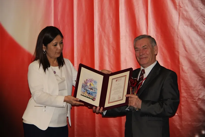 UFA, 27 April 2015. /Bashinform News Agency, Leila Aralbaeva/. In Istanbul, the awarding ceremony of the international prize «Kizil Elma» («Red Apple") took place. The awards were presented to bright representatives of more than 20 Turkic countries and republics for outstanding achievements in nine categories - in diplomacy, business, science, technology, culture, sports. The ceremony was held for the second time in the framework of the IV World Turkic Forum. The honourary award in the category "Culture" for the integration of the Turkic culture in the world community was handed over to Nur Dautov, the famous Bashkir composer by the Secretary-General of the Forum Almagul Isina.