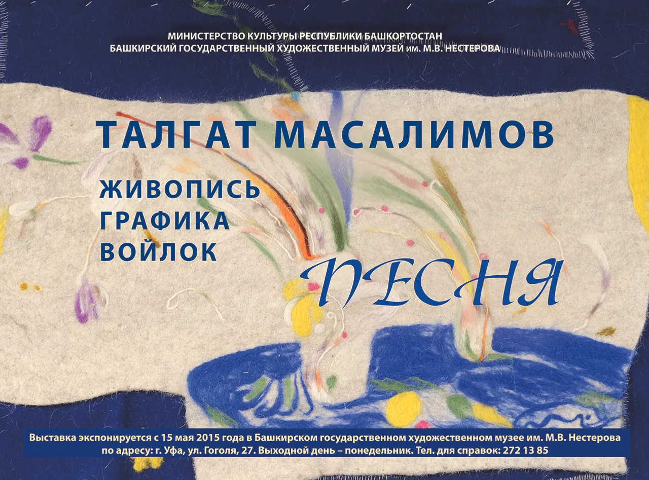 The 11-12 halls will open their doors for the exhibition "Pesnya" (Song). There will be exhibited drawings, paintings, and felt works by the Honoured Artist RB, winner of the G.Salyam Prize, Honoured Worker of Higher Professional Education of Russia, dean of art-graphic faculty of Bashkir State Pedagogical University, Professor Talgat Masalimov dedicated to the 55th anniversary of the artist.