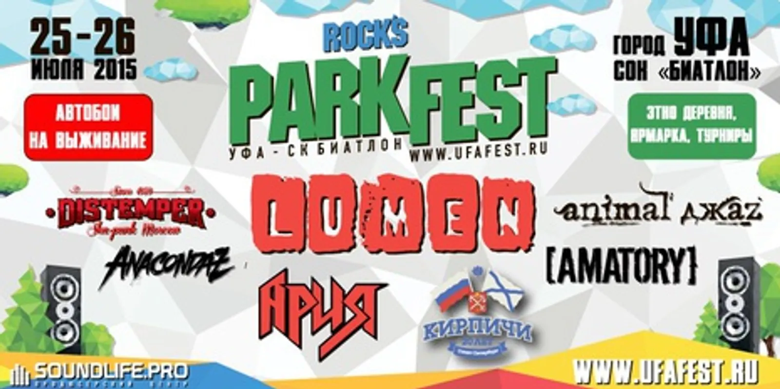Recall that the Rock's Park Fest will be held at sports complex «Biathlon» on July 25-26. The Ufa group «Lumen» will be a headliner. Also it will feature the groups «Aria», «Amatori», «Animal Jazz», «Kirpichi», «Anacondaz», «Murakami», «God Zmei», «More & Relsy», «Smeh. Igrushki», Klim Egorov, Artemiy.
