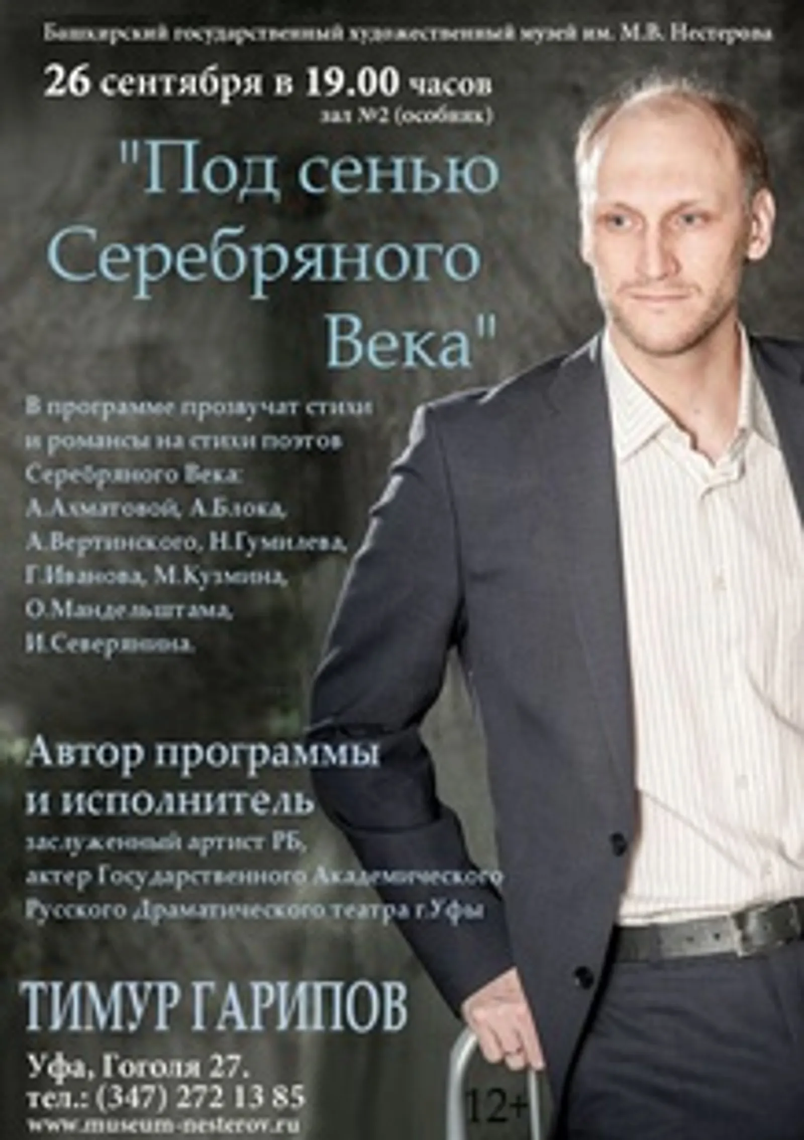 Timur Garipov is the Honoured Artist of Bashkortostan, winner of the State Prize named after Shaikhzada Babich, Honoured Worker of Culture RB, winner of the "Masters of the Word" competition declared by the Union of Theatre Workers under the motto "The Golden Age of Russian Poetry". Timur Garipov admirers will see a lyrical performance on the background of the masterpieces of Russian painters of the 19-20th centuries, the press service of the museum informs.