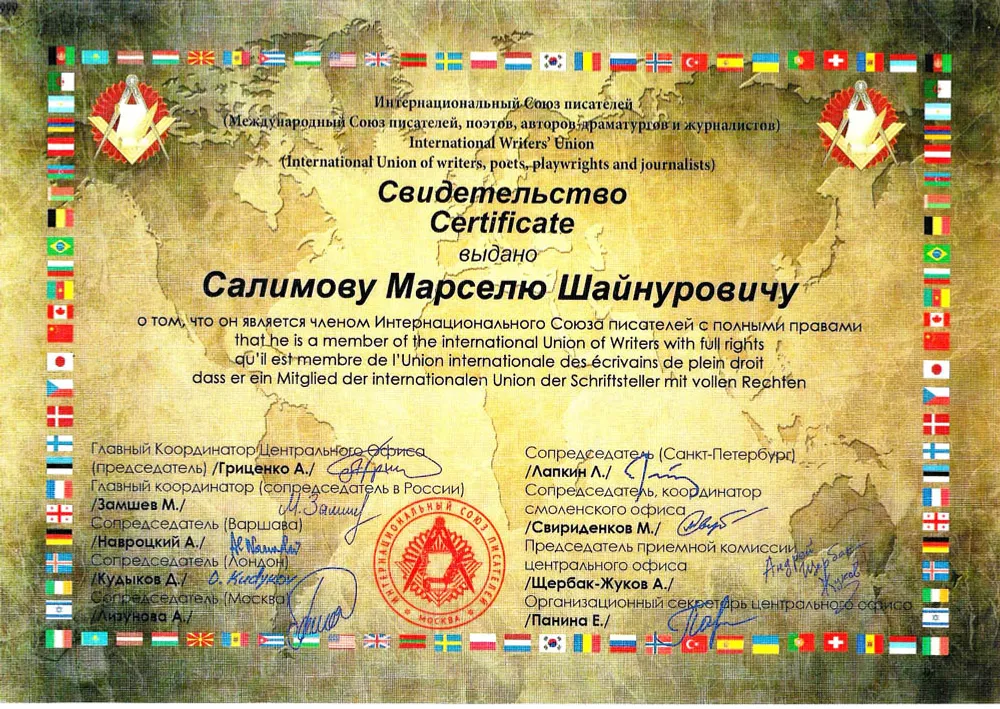 The International Board of the International Community of Writers and Journalists issued a certificate to Marsel Salimov "For Merits in Literature".
