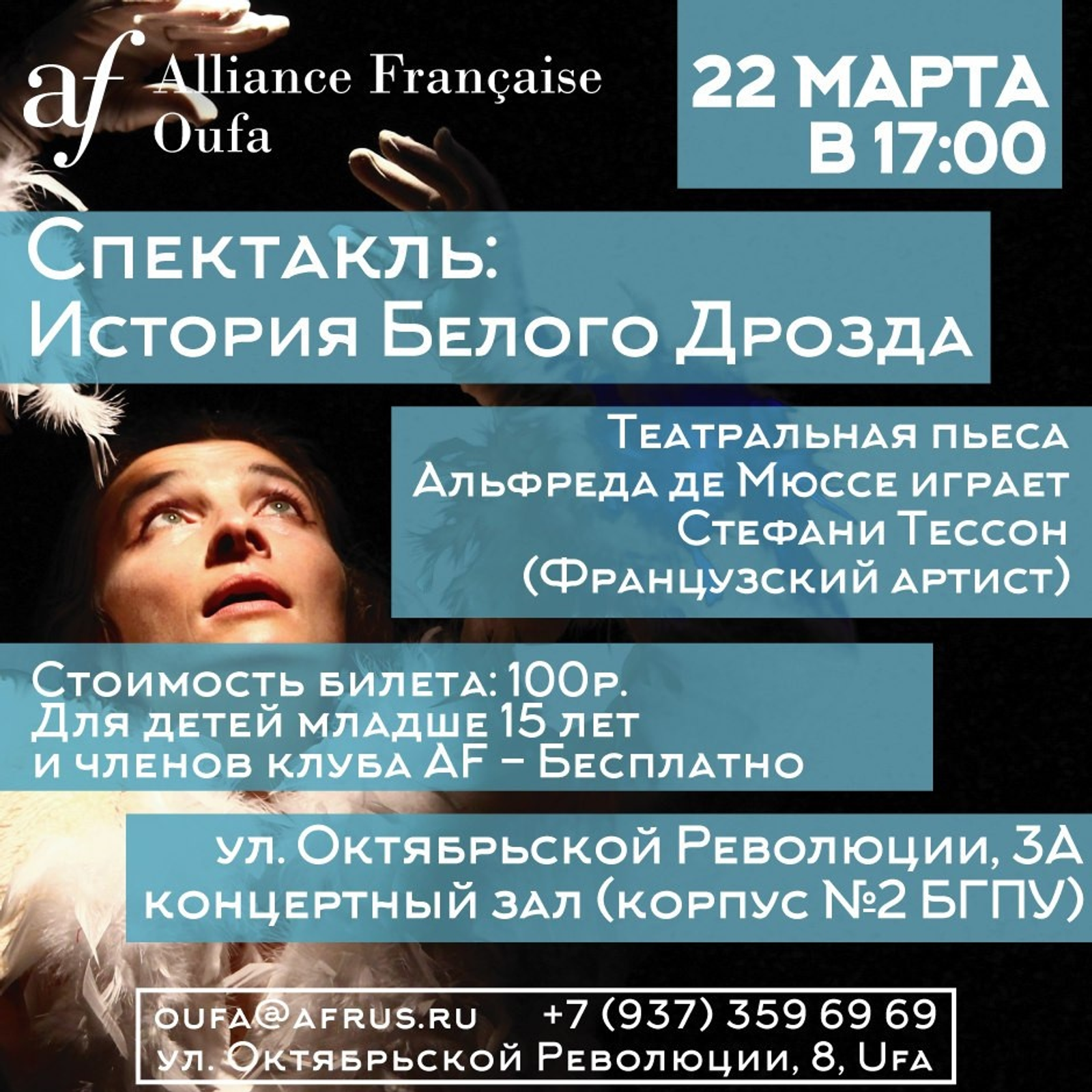 The play "The History of the White Blackbird" will be shown at the concert hall of Bashkir State Pedagogical University on March 22. The work by the French classics Alfred de Musset will be presented by a well-known French actress Stephanie Tesson. Beginning is at 17.00.