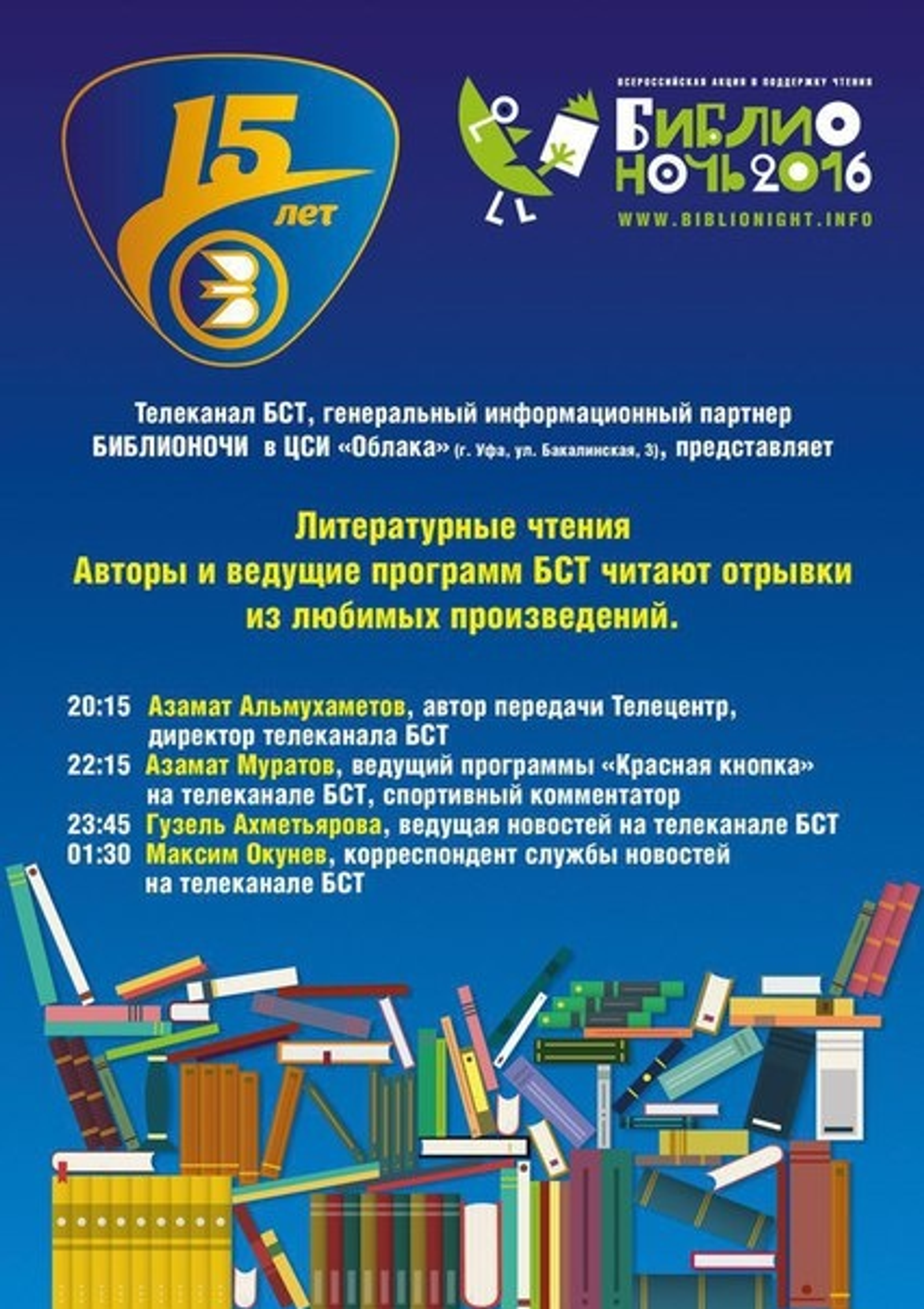 This year Biblionoch is held under the slogan "Read a Movie!". The general media sponsor of the event in Ufa - is BST TV channel.