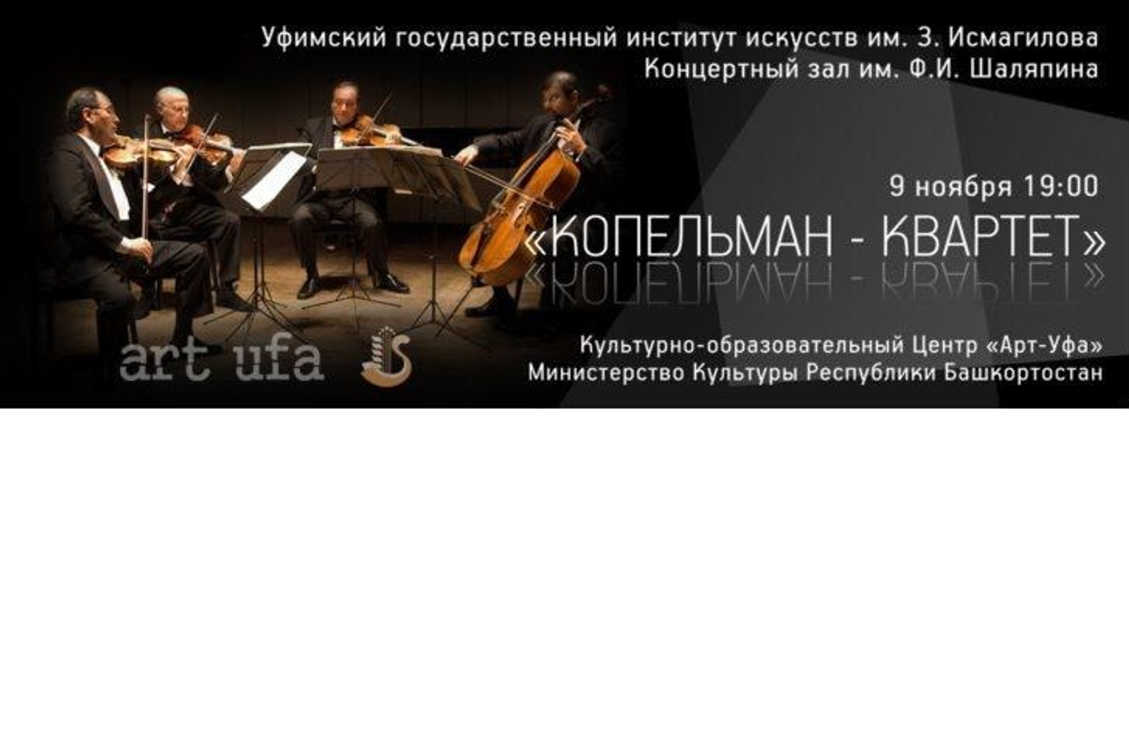 "In May 2016 we became co-organizers of the Vladimir Spivakov First International Violin Competition, where Mikhail Kopelman was the chairman of the jury. Today Ufa already meets Michael Kopelman and his quartet as the outstanding performers. We are pleased that we were able to organize this concert. We hope that in the future we will be able to please the citizens of our republic with new, vibrant, cultural projects", said the chairman of the "Art-Ufa" Vasily Peganov.
