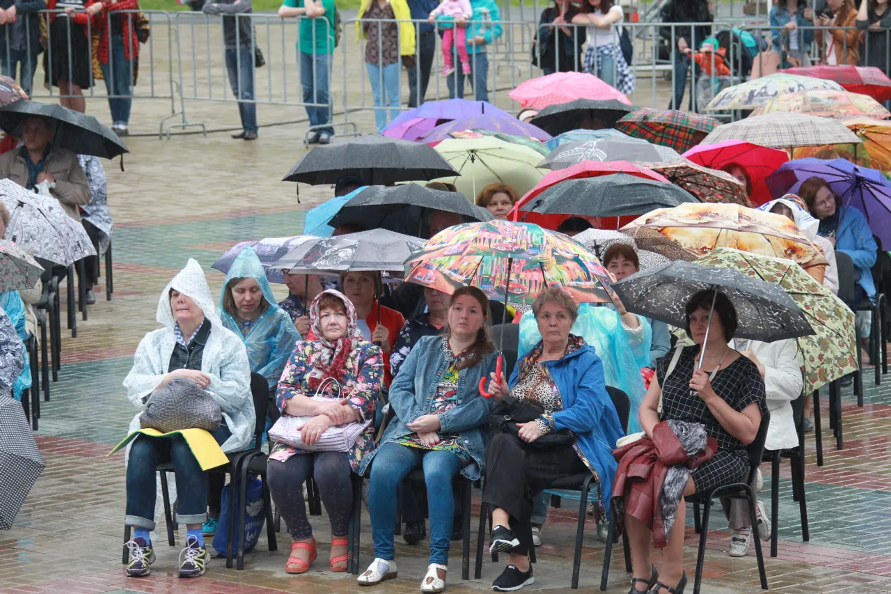 UFA, 16 June 2017. /Bashinform News Agency, Leila Aralbaeva/. The Ufa Amphitheatre hosted the first Symphony Night of the International Festival of Arts "The Heart of Eurasia". Due to heavy rain the Ufa towsnpeople had to open umbrellas and put on raincoats.