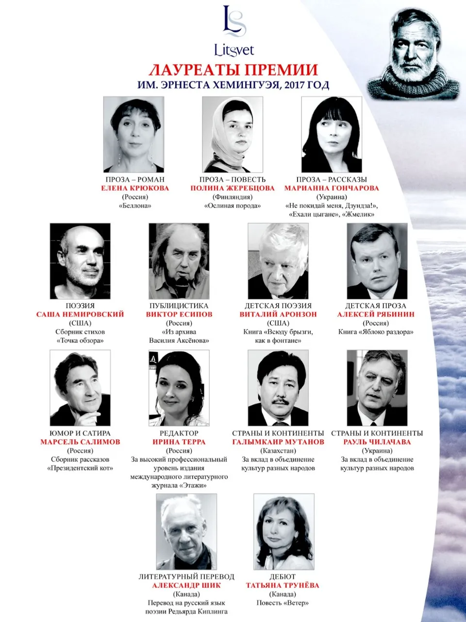 The Canadian annual literary award was established in 2015 by the publishing house "Litsvet" and the "Novy Svet" magazine (Toronto) to support Russian-speaking authors. It is dedicated to the outstanding American writer, Nobel Prize laureate in literature Ernest Hemingway, who began his career in Canada, working as a reporter for the Toronto Star newspaper.