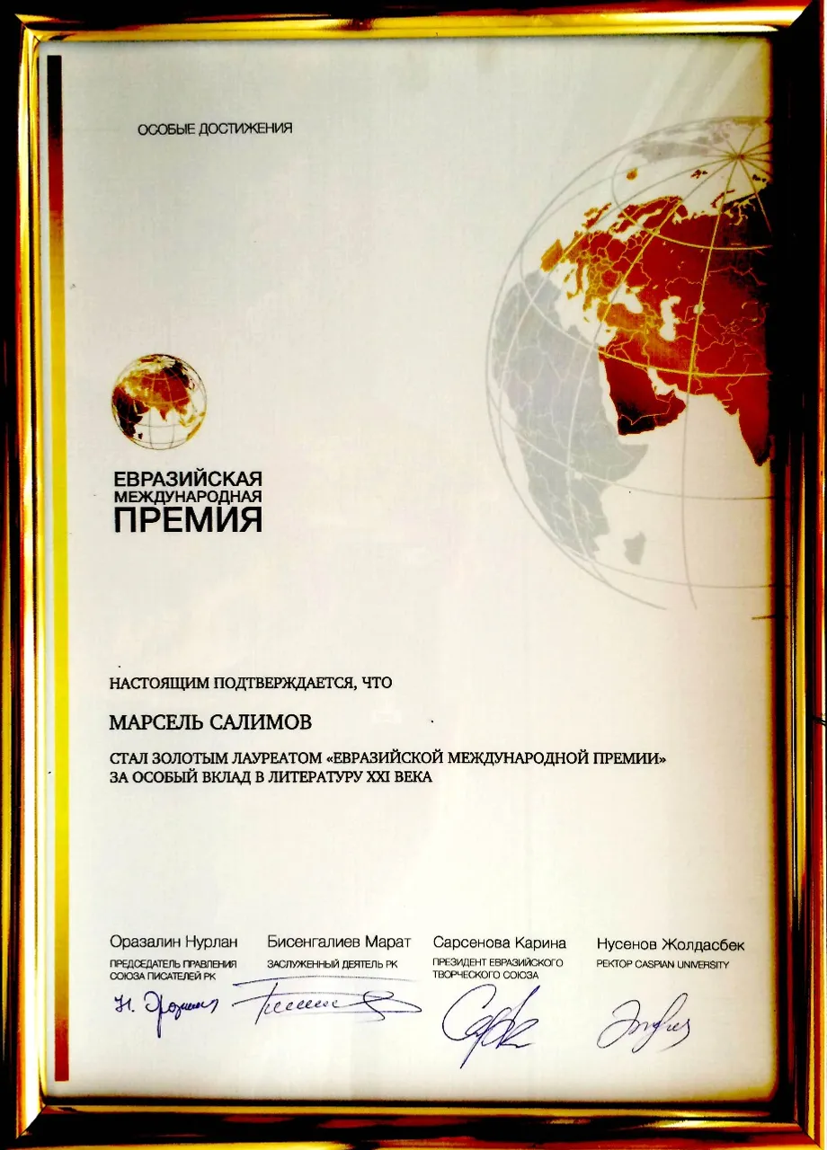 He was nominated for an international prize by the Eurasian Creative Guild (London) in cooperation with the Hertfordshire Press Publishing House, which published the fortieth book by Marcel Salimov "The Book Which Has Never Been Written Before" in English.