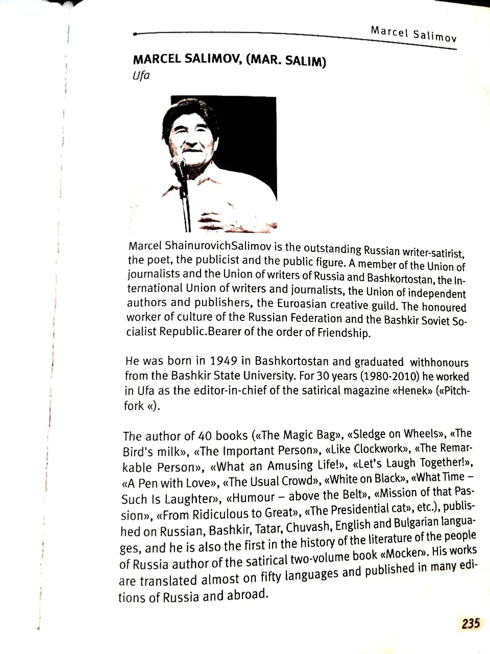 It should be noted that recently, under the auspices of the Moscow City Organization of the Writers' Union of Russia, the directory "The Best Poets and Writers of Russia 2017" in Russian and English was published in 3000 copies. It published biographical information and remarks about the work of Mar. Salim by such outstanding personalities as Sergei Mikhalkov, Mustai Karim, Valery Ganichev, secretary of the Union of Journalists of Russia Mikhail Fedotov.