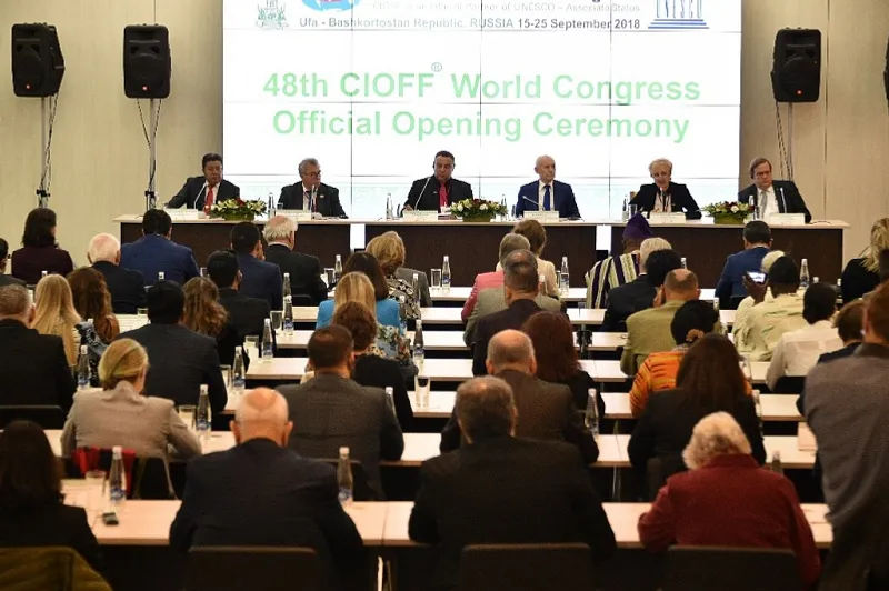 UFA, 20 September 2018. /Bashinform News Agency/ translated by Tatiana Aksyutina/. On September 19, at the Ufa Congress Hall, the Head of Bashkortostan delivered a speech at the official opening ceremony of the 48th World Congress and the General Assembly of the International Council of Organizations of Folklore Festivals and Folk Arts (CIOFF).