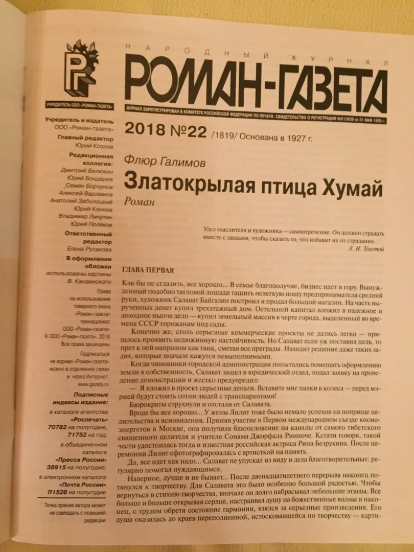 The "Roman Gazeta" magazine published the novel by Flyur Galimov "The Golden-Winged Bird Humai". 600 copies of this issue were sent to Germany, to universities, colleges, libraries, and German lovers of the Russian literature.