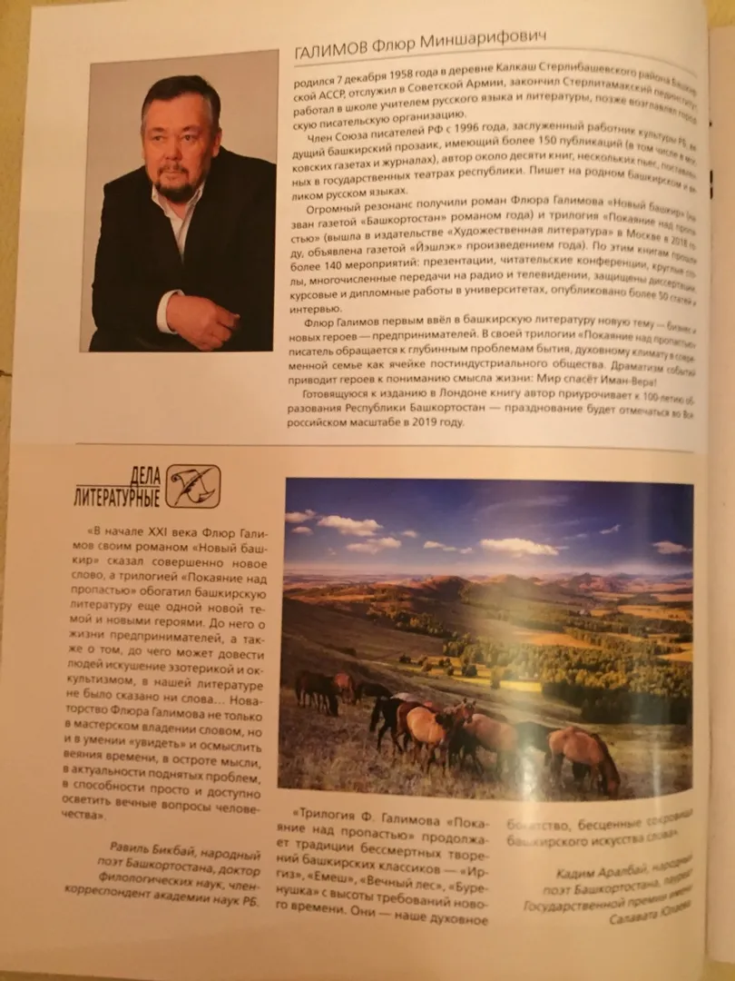 As reported by the Bashinform News Agency, the Moscow "Hudozhestvennaya Literatura" publishing house in 2018 published the "Repentance of above the Steep” trilogy translated into Russian by the author. The book was presented at the 31st International Book Fair with the participation of 300 publishing houses from 25 countries. It is planned to publish a review by the famous Russian literary critic Lev Anninsky on the trilogy by Flyur Galimov in the December issue of the “Unost” magazine.