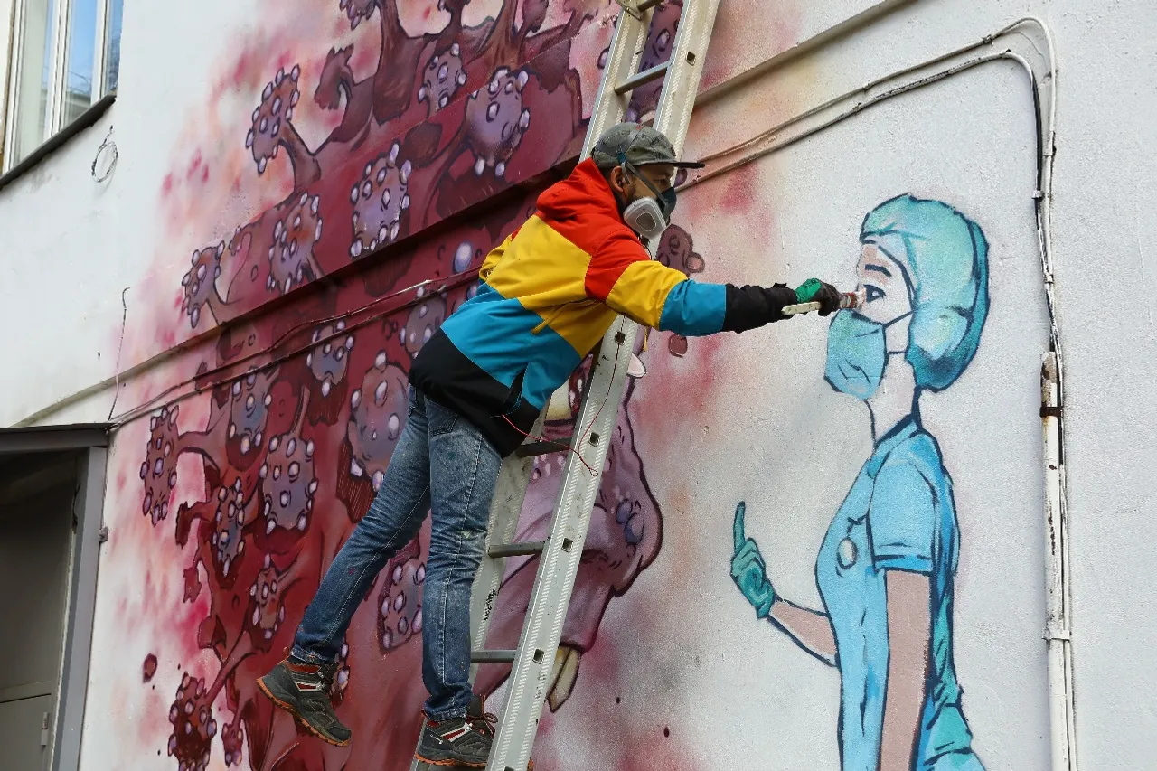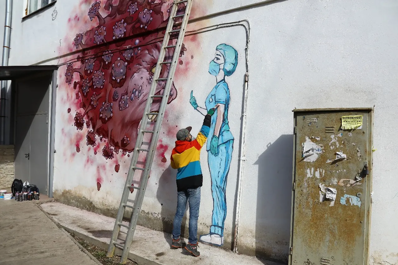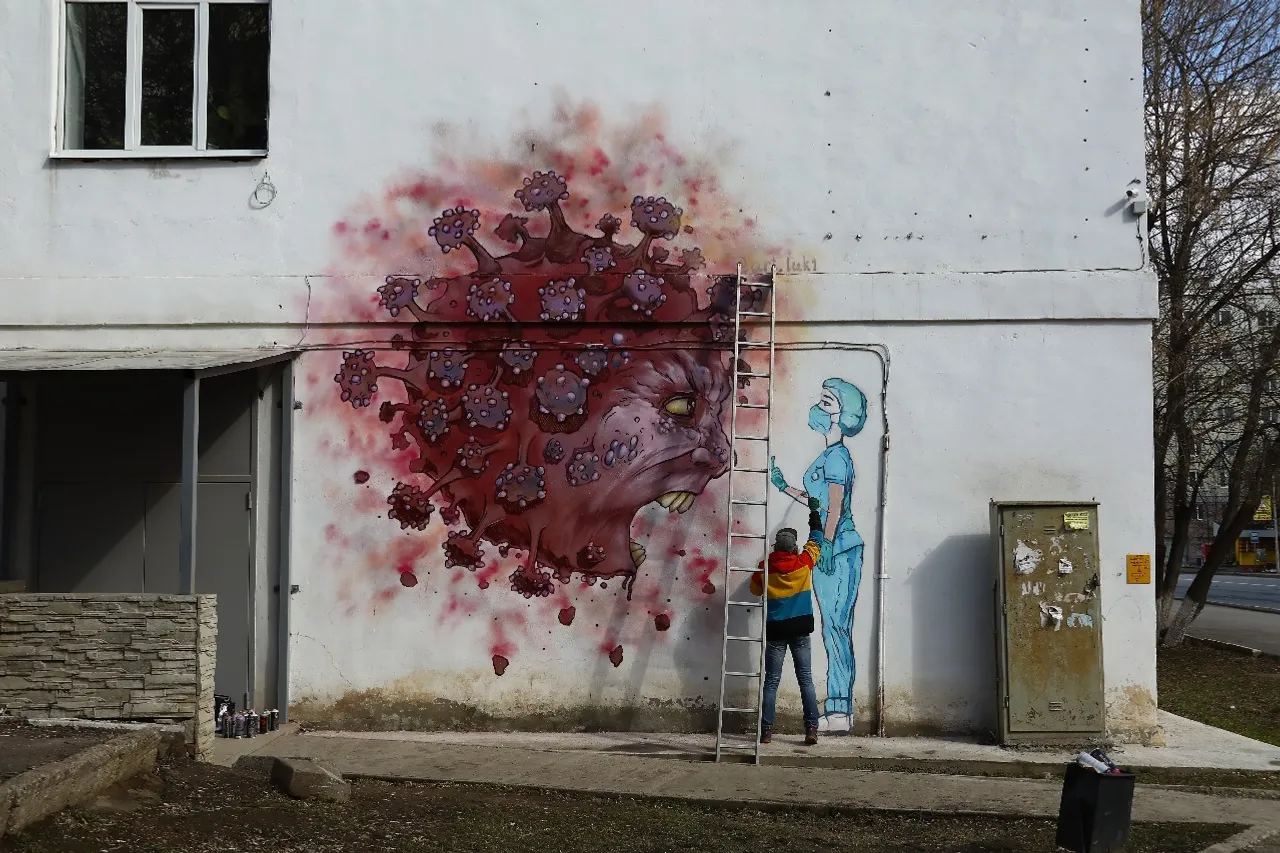 In Ufa opposite the Kuvatov Republican Clinical Hospital, the artist Arthur Lukyanov painted graffiti in support of 1,200 medical professionals and patients who are in strict quarantine here due to the coronavirus.