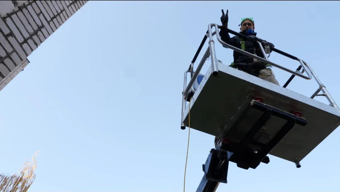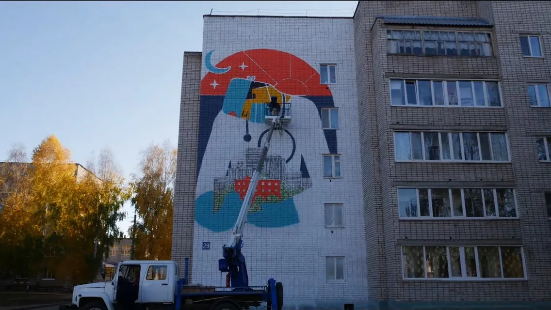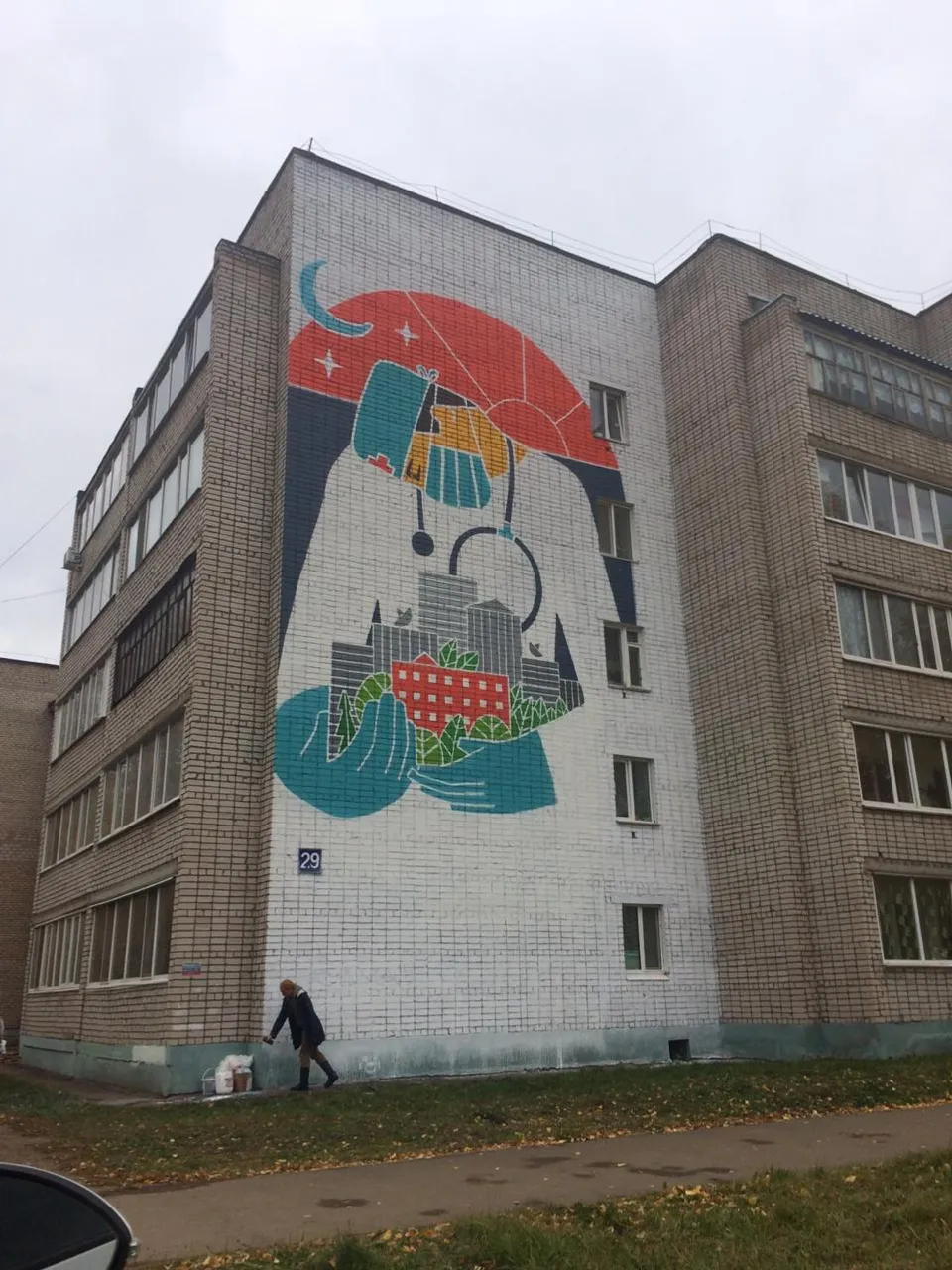 New graffiti dedicated to doctors has appeared in Neftekamsk. A multi-story residential building facade is decorated with an image of a doctor holding an entire city like a child in his arms.