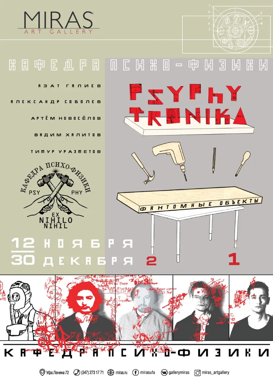 A "Phantom Objects" exhibition opens at the Miras Gallery in Ufa on November 12. The exhibition is attended by Alexander Sobolev, Azat Galiev, Artem Novosyolov, Vadim Khalitov, Timur Urazmetov.