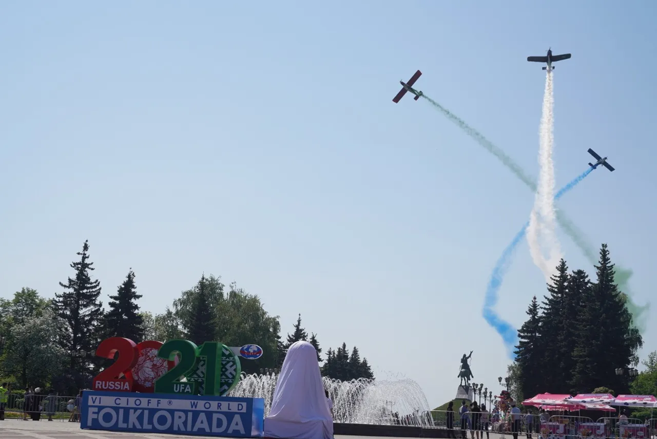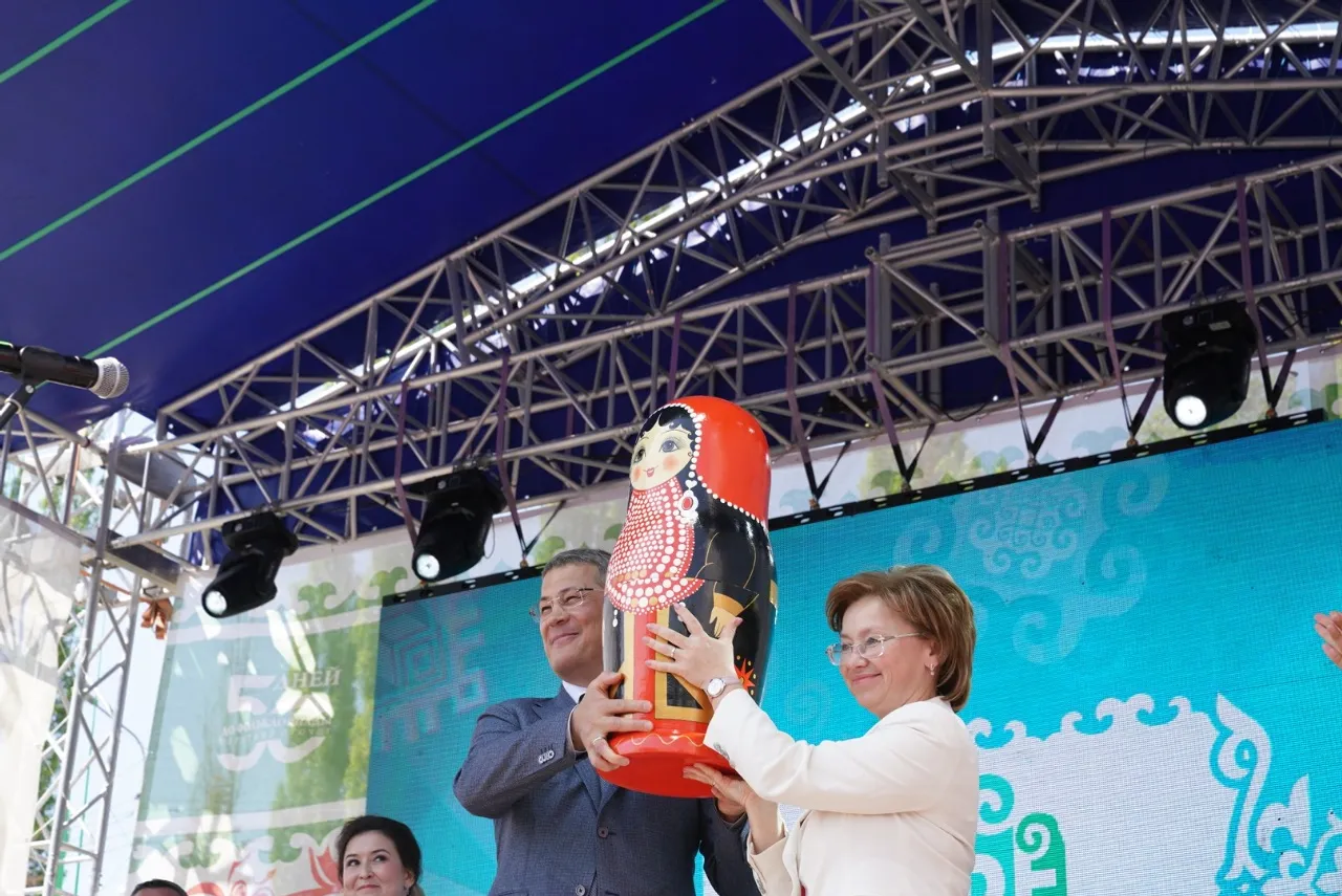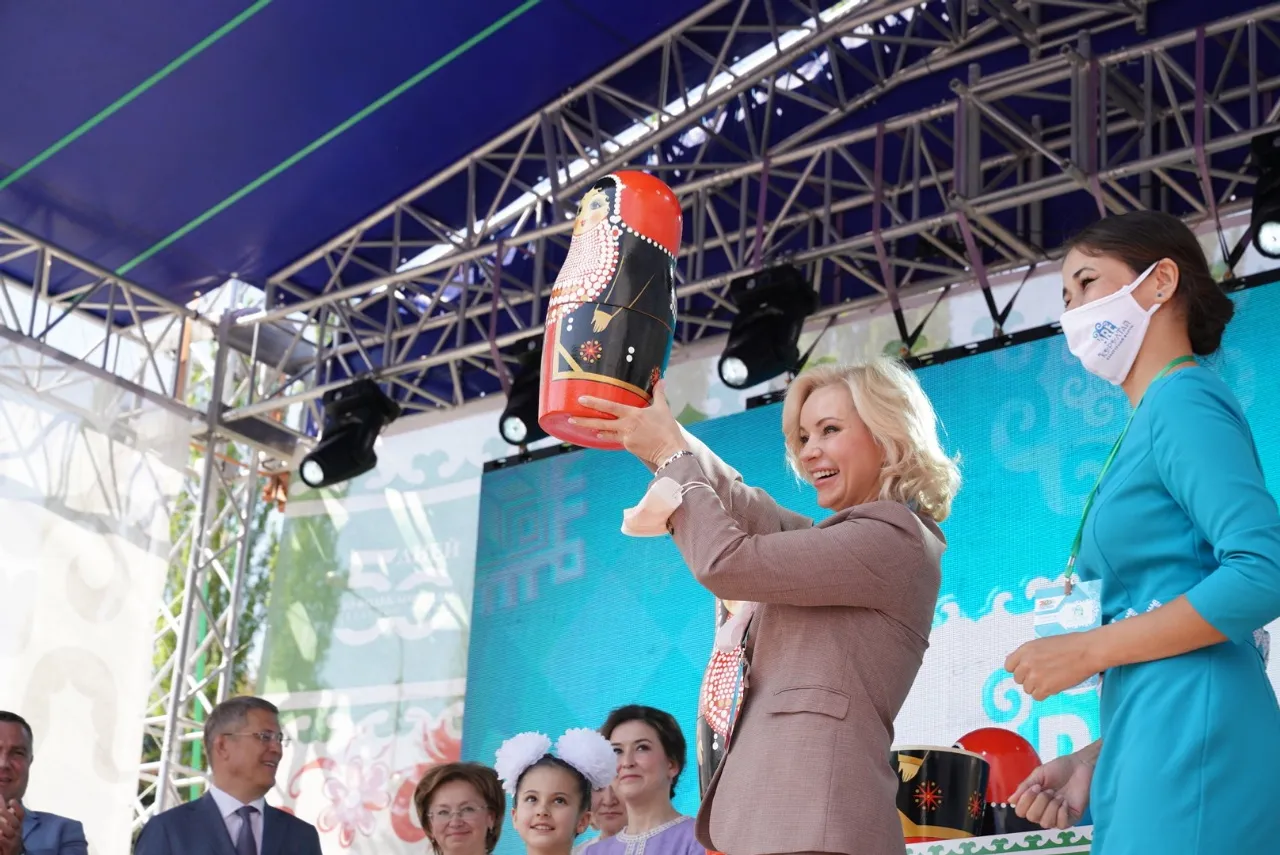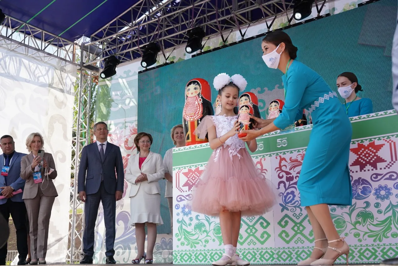 The Russian tricolor flew over the audience's heads - three small aircraft from Pervushino staged an air show. Having made a circle over the Belaya River, the planes returned to the sky above the square to land several parachutists with the flags of Russia, Bashkortostan, and the Folkloriada. One of the parachutists gave the young participant of the holiday a symbolic gift - a small Matryoshka flying in the sky. The event continued on the stage, where the guests of honor helped to assemble the Matryoshka, which traditionally consists of several dolls.