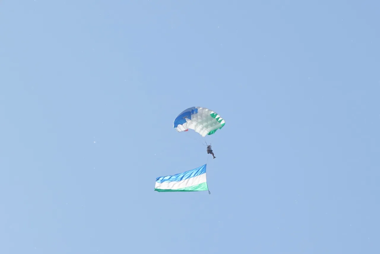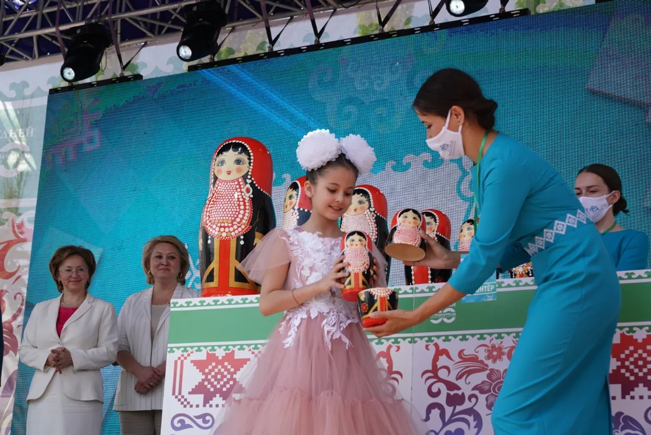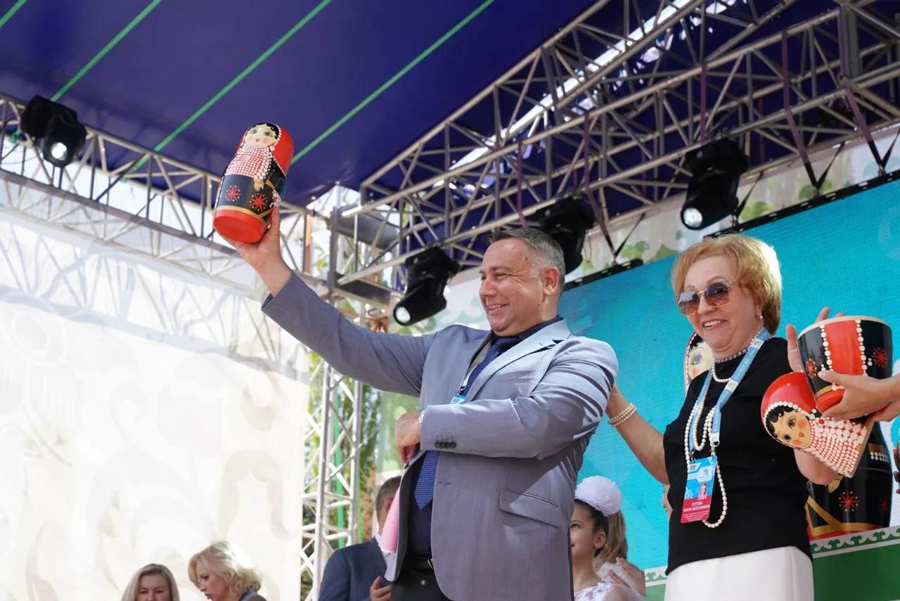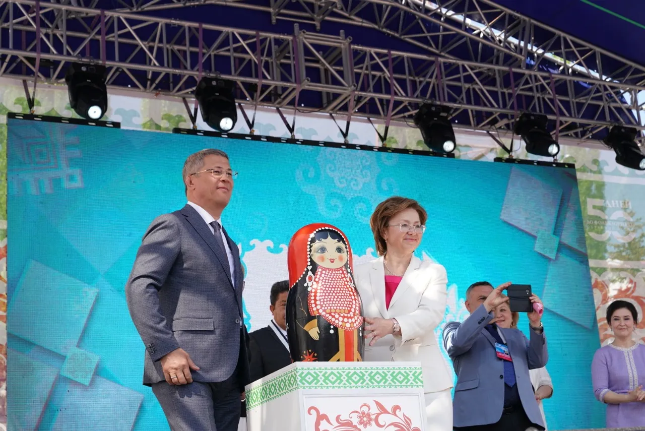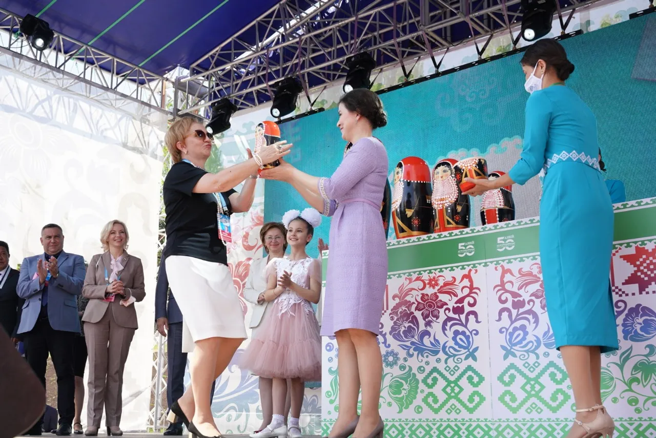The Russian tricolor flew over the audience's heads - three small aircraft from Pervushino staged an air show. Having made a circle over the Belaya River, the planes returned to the sky above the square to land several parachutists with the flags of Russia, Bashkortostan, and the Folkloriada. One of the parachutists gave the young participant of the holiday a symbolic gift - a small Matryoshka flying in the sky. The event continued on the stage, where the guests of honor helped to assemble the Matryoshka, which traditionally consists of several dolls.