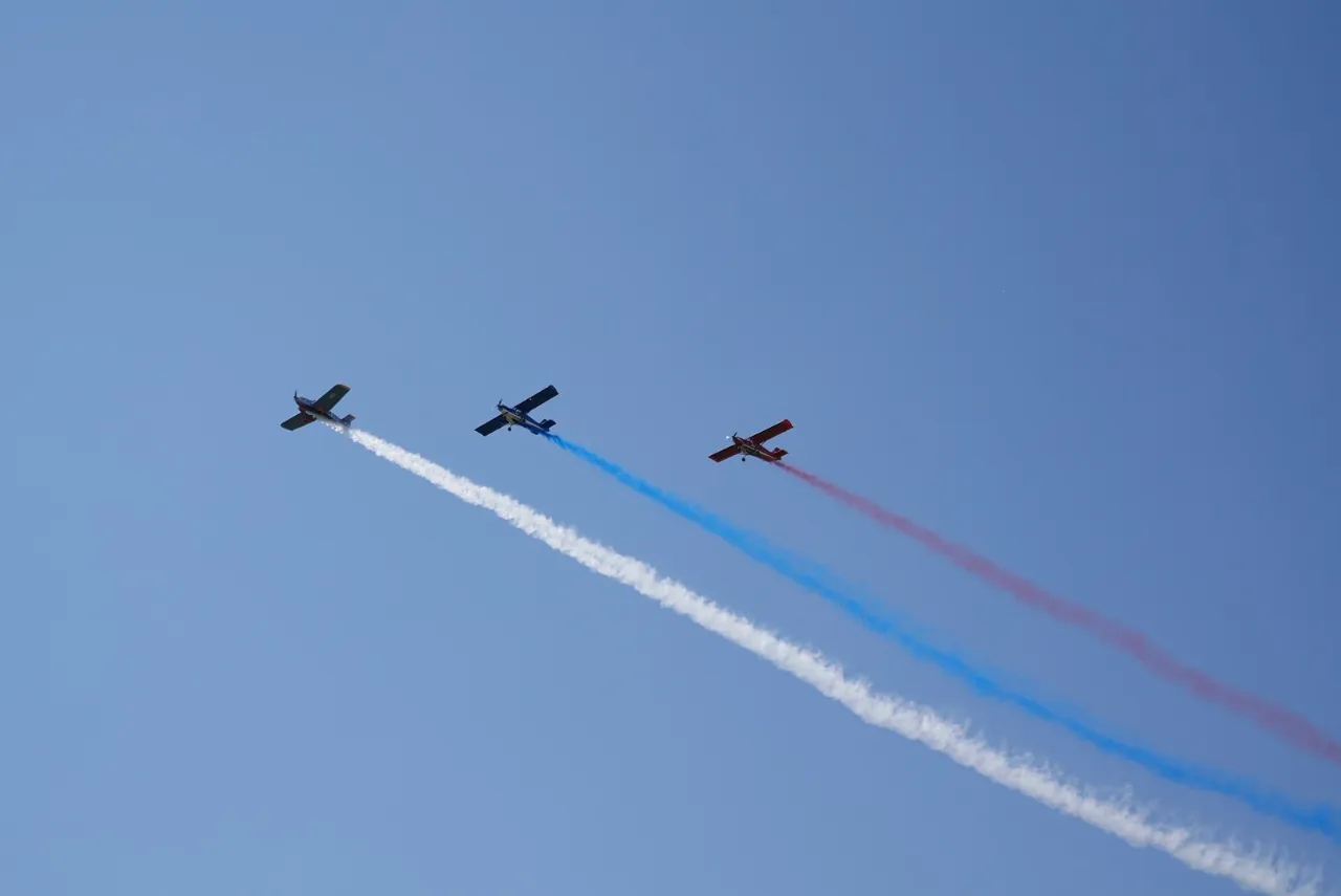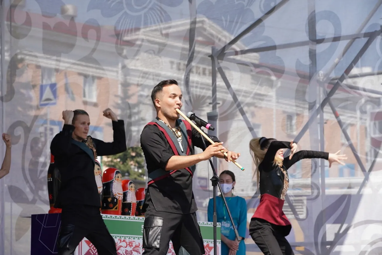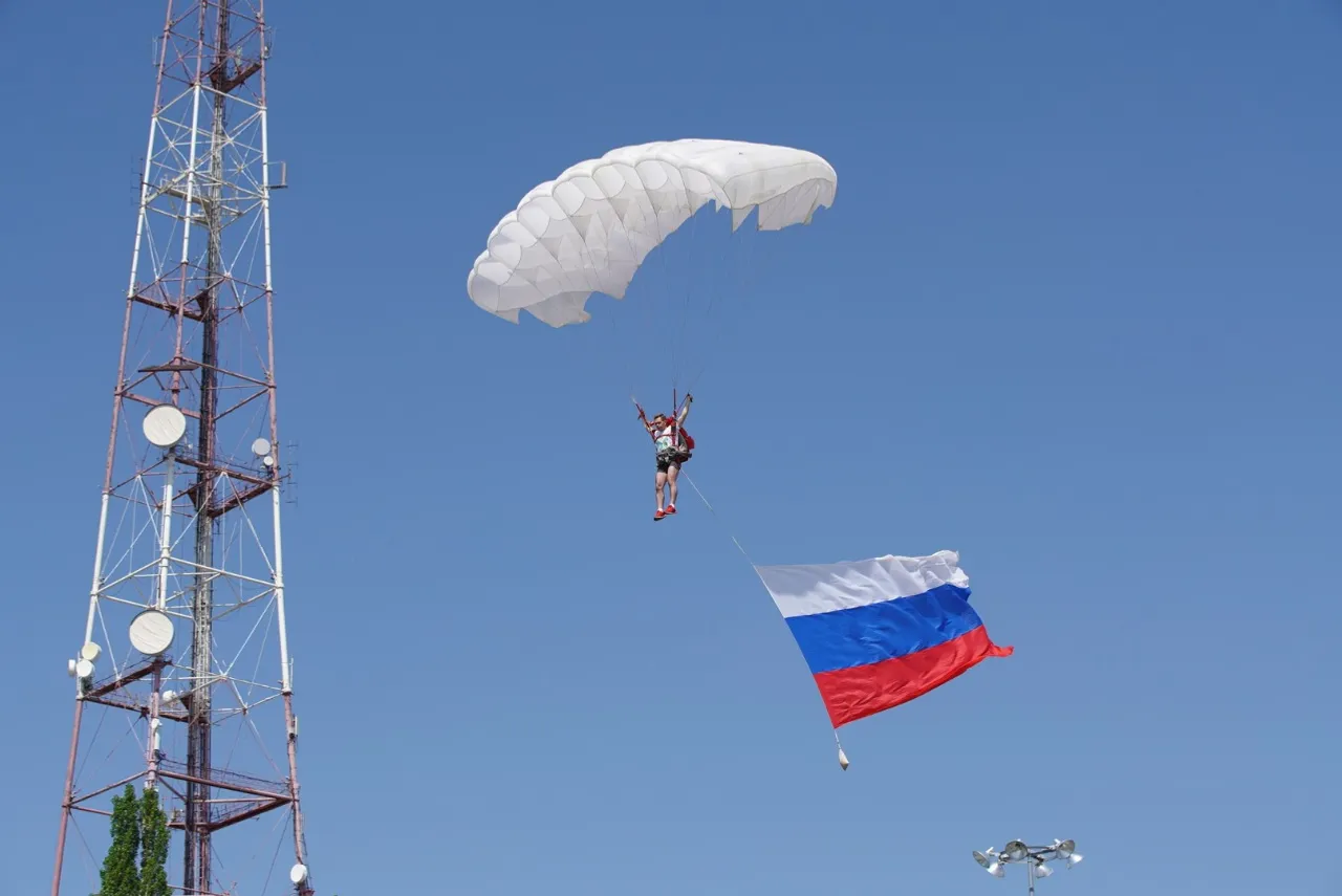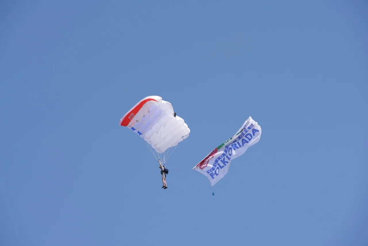 The Russian tricolor flew over the audience's heads - three small aircraft from Pervushino staged an air show. Having made a circle over the Belaya River, the planes returned to the sky above the square to land several parachutists with the flags of Russia, Bashkortostan, and the Folkloriada. One of the parachutists gave the young participant of the holiday a symbolic gift - a small Matryoshka flying in the sky. The event continued on the stage, where the guests of honor helped to assemble the Matryoshka, which traditionally consists of several dolls.