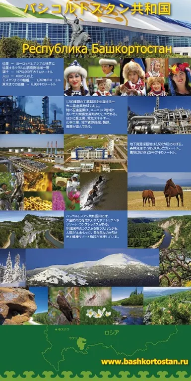 Republic of Bashkortostan is located in the South Ural, on the borderline of Europe and Asia. Its territory is 54 thousand square miles. The population is more than 4 million people. The distance to Moscow is 870 miles and to Tokyo – 3800 miles. The Republic is notable for its preferable geographic dislocation near the largest regions of the European part of Russia, Siberia and the countries of the Central Asia.