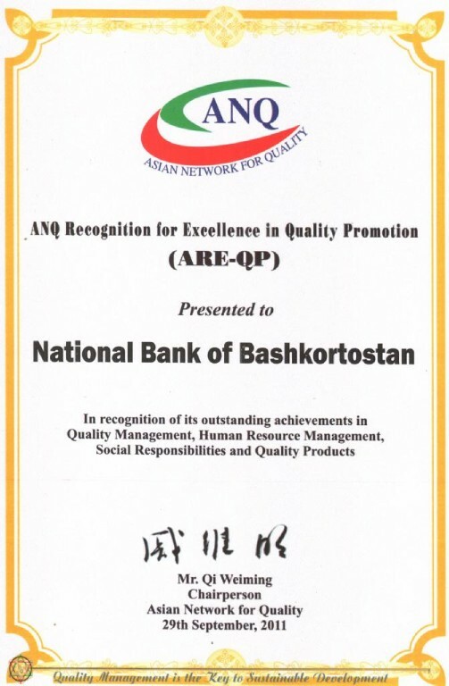 The National Bank of Bashkortostan is rewarded with diploma of the Asian Network for Quality