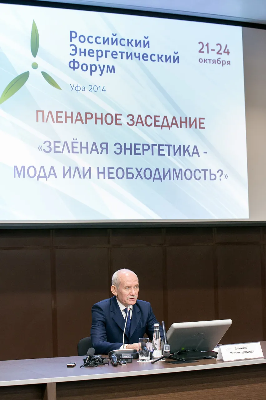 UFA, 21 October 2014. /Bashinform News Agency, Iliya Spiridonov/. The President of Bashkortostan Rustem Khamitov visited the XIV Russian Energy Forum, which opened today at Ufa exhibition complex "VDNkH-Expo". The head of the republic met with the professor of the Moscow Power Engineering University, Doctor of Technical Sciences Viktor Kudryavy and delivered a speech at the plenary session devoted to "green energy".