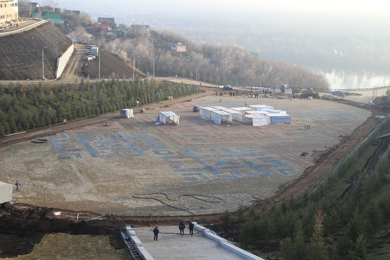 UFA, 5 November 2014. /Bashinform News Agency, Elvira Latypova/. Ufa amphitheatre will retain its function as an open air venue. Now accomplishing works are being conducted on the site beyond the Congress Hall, the «Ufa-2015 SCO BRICS Office Group» informs. An area of 9,000 sq m will be paved with tiles of eight colours in the form of national ornament.