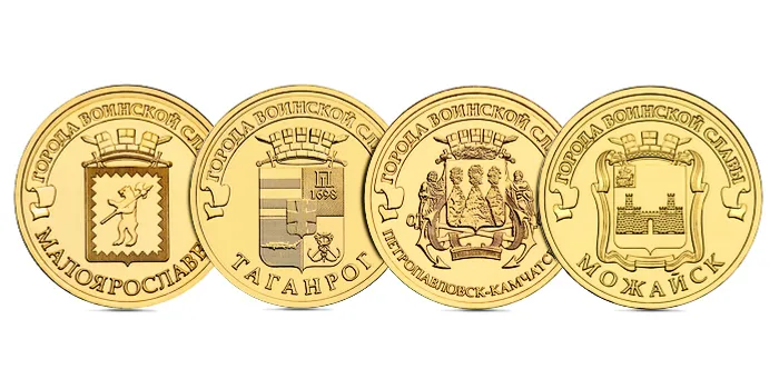 Four coins of 10 rubles and with a circulation of 10 million pieces of each type will be released in the series "City of Military Glory". The coins depict the coats of arms of such cities as Taganrog, Petropavlovsk-Kamchatsky, Maloyaroslavets, Mozhaisk. In this series 37 coins are already in circulation. The latter was issued this year on November 24.