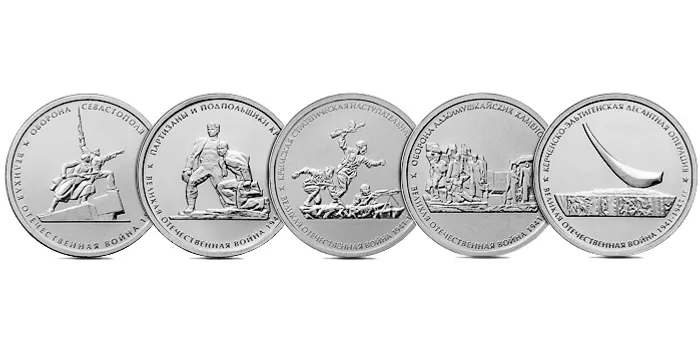 Five-ruble coins from non-precious metals are devoted to heroism of Soviet soldiers who fought in the Crimean Peninsula in the Great Patriotic War - "Defense of Sevastopol", "Defense of Adzhimushkay Quarry", "Kerch-Eltigen Operation", "Crimean Strategic Offensive Operation", "Crimean Guerilla Fighters and Undergrounders". The circulation is two million pieces of each type.