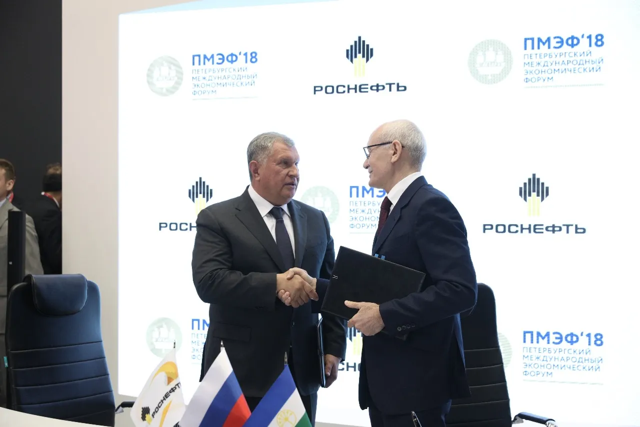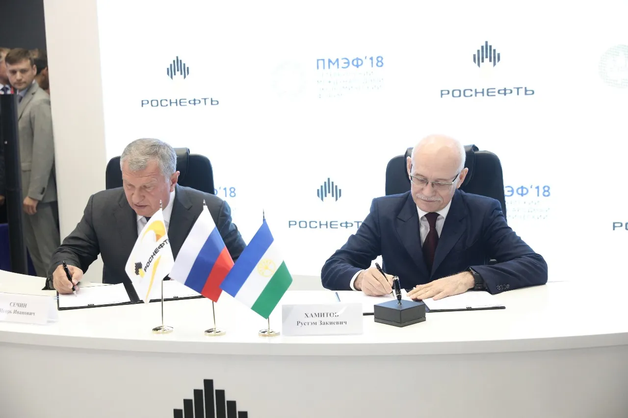UFA, 25 May 2018. /Bashinform News Agency/ translated by Tatiana Aksyutina/. Today, the Republic of Bashkortostan and PJSOC Rosneft signed an agreement aimed at expanding cooperation in the social development of the region at the St. Petersburg International Economic Forum. The Head of Bashkortostan Rustem Khamitov and Chief Executive Officer of PJSOC Rosneft Igor Sechin affixed their signatures to the document.