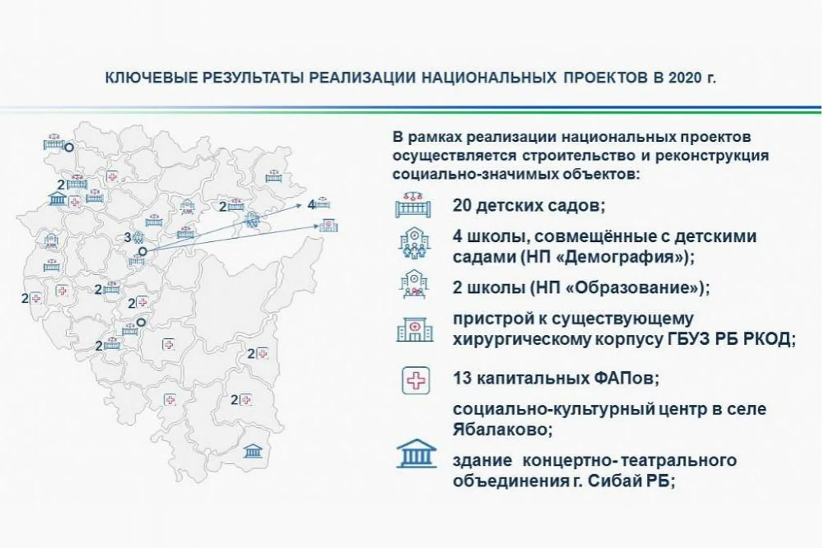 The total amount of budget funds provided for national projects is 31.1 billion rubles in 2020, of which federal funds are 20 billion rubles. In terms of federal funding, Bashkortostan ranks second in the Volga Federal District after the Samara Region. The first vice-premier - the government chief of staff, Ilshat Tazhitdinov, said that the best indicators were achieved with the implementation of such national projects as "Demography", "Culture", "Healthcare", "Small and Medium-Sized Enterprises".