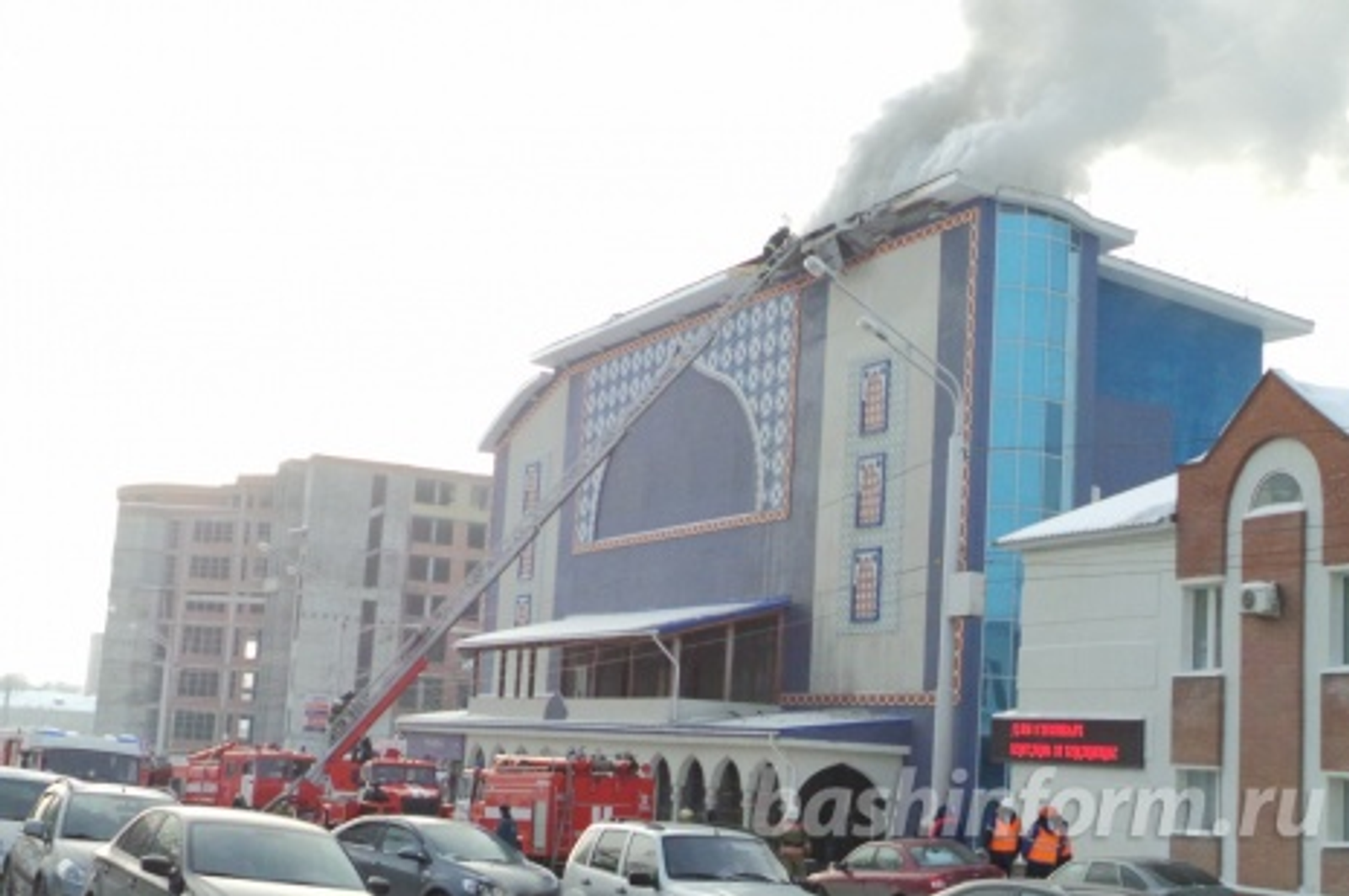UFA, 28 January 2016. /Bashinform News Agency, Arthur Basyrov, Ksenia Kalinina/. In Ufa the nightclub «Bar Skazka» is on fire now. According to the reporter of the Bashinform Agency about seven fire engines arrived to extinguish the fire. Firefighters are liquidating the fire under the roof. The scene is cordoned off; the road along Parkhomenko street is blocked.