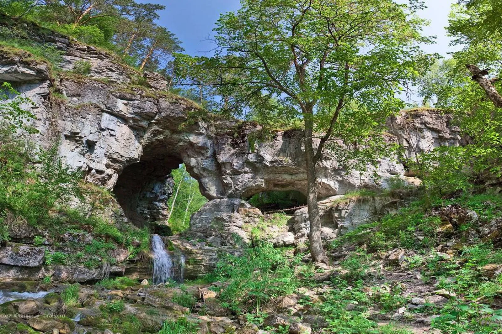 A company of travelers climbed to the highest point of the waterfall - a karst bridge, one of them slipped and fell on the rocks from almost ten meters height. The man suffered a broken leg and multiple bruises.
