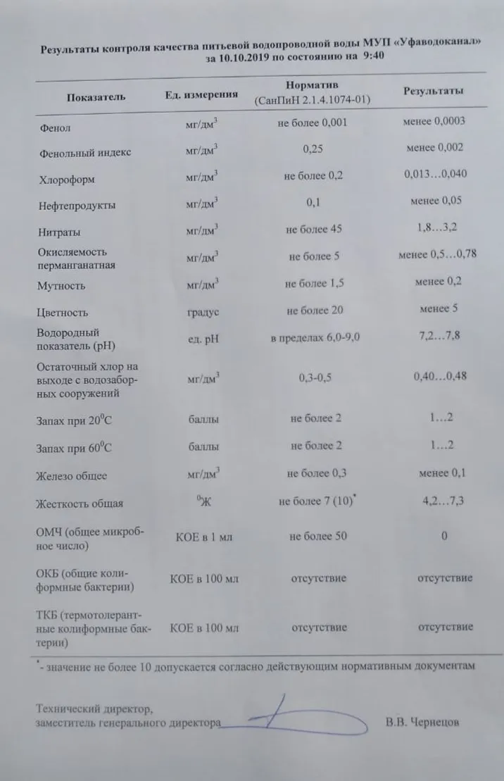 As of 9.40 a.m. on October 10, no excess of chemicals was detected in drinking water: phenol, chloroform, and others, Ufavodokanal reports.