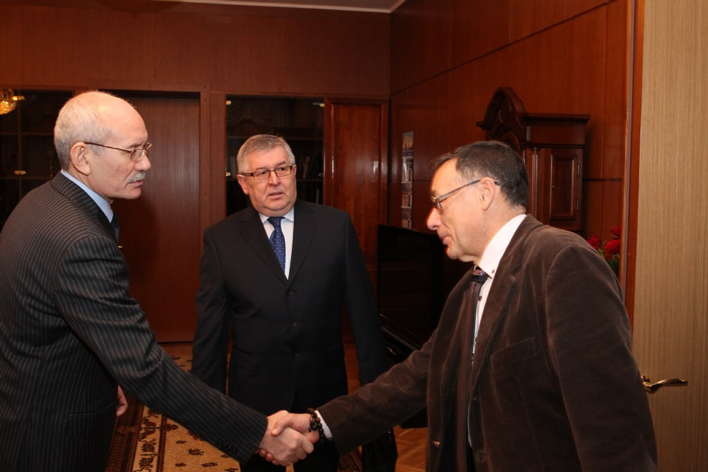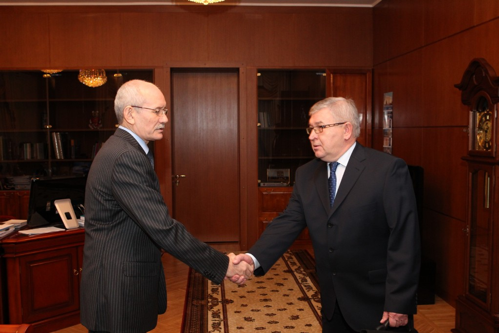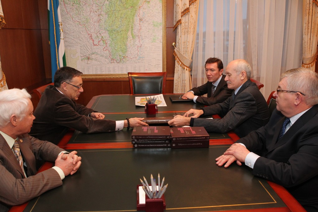The President of Bashkortostan Rustem Khamitov held a meeting with the first deputy director of the Institute of Economics under the Russian Academy of Sciences Dmitry Sorokin and with the deputy director of the Institute of economics and industrial production organization under the Siberian division of the Russian Academy of Sciences (Novosibirsk) Viktor Suslov and the possibilities of practical realization of the economic models, offered by the leading economists of the country, was the main subject-matter of the discussion. The rector of Ufa State Academy of economics and service Alexander Degtyarev was also present at the meeting.