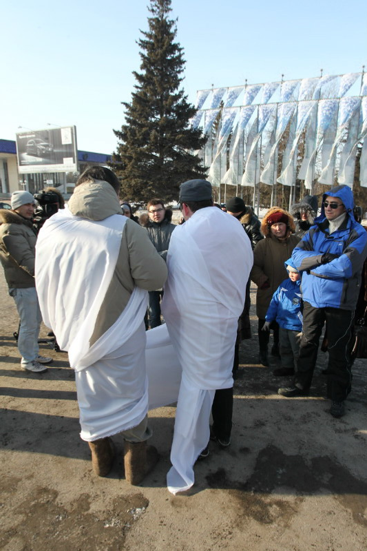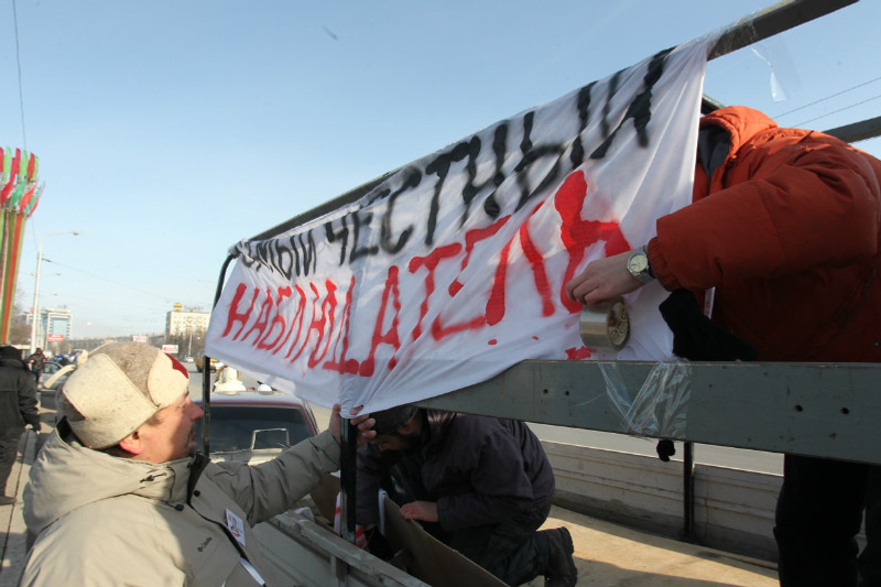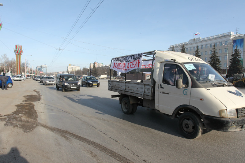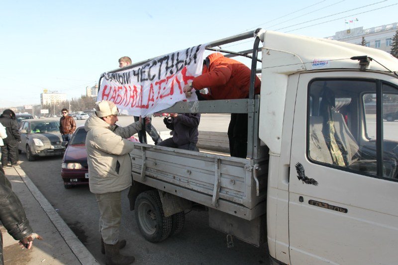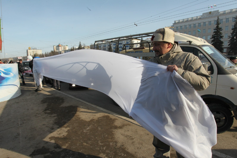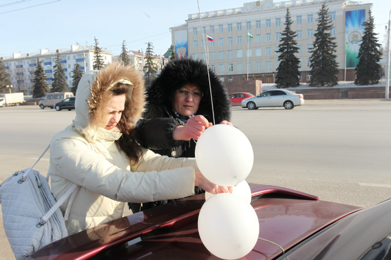 The motor race “For Honest Elections”, initiated by the regional division of Russian Motorists Federation and public movements “Ufa Voice” and “The Most Honest Observer” is under way in Ufa. The cars with white ribbons and white balls are moving along the October Avenue to the TV Center. At the beginning of the race its initiators stretched the biggest white ribbon, symbolizing honest elections, on the square in front of Ufa administration.
