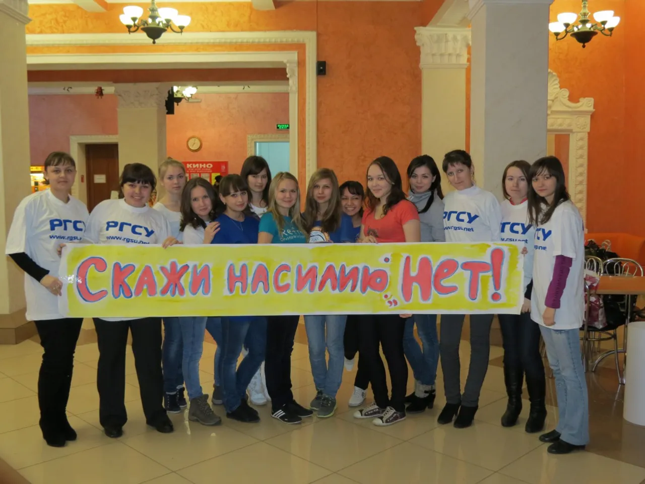 Within the frames of the international action “16 Days Against Violence in Respect of Women” the Union of Women RB has held the action “No to Violence in Respect of Women and Kids!” jointly with Russian State Social University’s Ufa division in the cinema-theater “RODINA”. Students of the University came out with the posters, urging to stop violence in respect of women and kids.