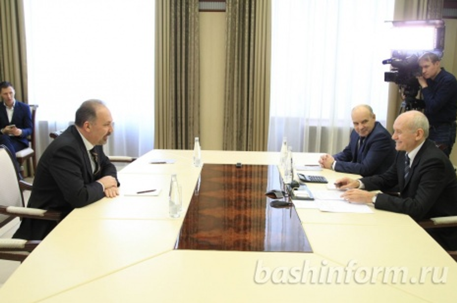 UFA, 18 December 2015. /Bashinform News Agency, Alexander Smirnov/. On December 18, at the House of the Republic a meeting of the Head of Bashkortostan Rustem Khamitov and the Minister of Construction, Housing and Communal Services of the Russian Federation Mikhail Men was held. They discussed the progress in the building complex of the region, issues of reforming and improving the system of housing and public utilities.