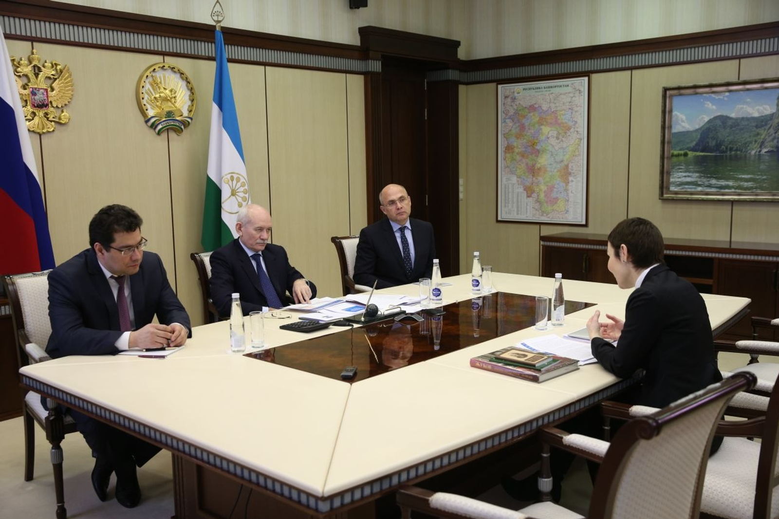 UFA, 11 March 2016. /Bashinform News Agency, Alexander Smirnov/. The Head of Bashkortostan Rustem Khamitov in the House of the Republic met with the Head of the Higher School of Health Care Organization and Management (VSHOUZ) Guzel Ulumbekova. Issues of Bashkortostan health care system development were discussed at the meeting.