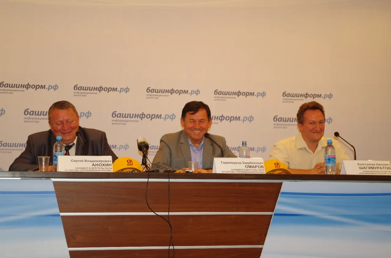UFA, 7 July 2016. /Bashinform News Agency, Galiya Nabieva/. The regional branch of "A Just Russia" party held a press conference at Bashinform News Agency. The head of the Citizen Rights Protection Centre of " A Just Russia" party Gadzhimurad Omarov, Sergei Anokhin, the chairman of the regional branch of " A Just Russia" party Konstantin Shagimuratov came at a meeting with reporters.