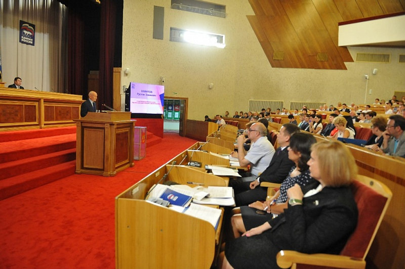 UFA, 8 July 2016. /Bashinform News Agency, Galiya Nabieva/. The Head of Bashkortostan Rustem Khamitov at a conference of the regional branch of the United Russia party in Ufa commented on the decision of the party Chairman, Prime Minister of the Russian Government Dmitry Medvedev on placing 19 governors the first in the territorial lists to the State Duma elections.