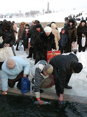 In the Epiphany night all Christian churches perform water consecration and long queues of Christian believers stretch near the churches to take the holy water. This water possesses healing properties. It doesn’t go bad and there is no need to keep it in a fridge. The believers always keep the bottles with holy water near the icons.
