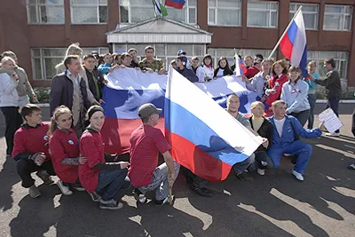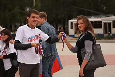 The motor race started on the Soviet Square and finished near the Congress-Hall with the distribution of the white-blue-red ribbons and booklets with the history of the Russian flag and the text of the Russian state hymn.