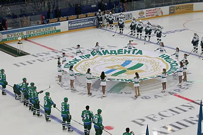 All comers have heard the message of welcome of the President of Bashkortostan, addressed to the participants and guests of the tournament. The President of Bashkortostan Rustem Khamitov has honored the first game of “Salavat Ulaev” with his presence. The honorable guest – the President of the Russian Ice Hockey Federation, legendary goal-keeper Vladislaw Tretyak was also present at the game.