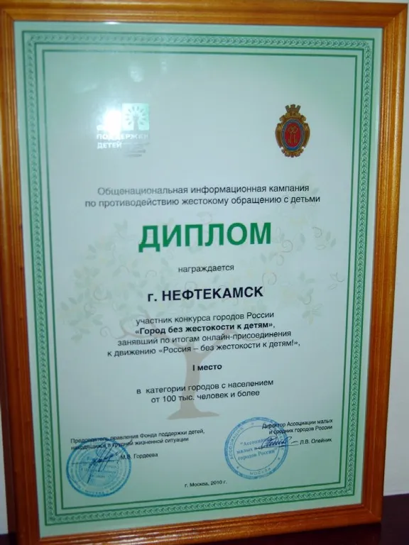 The cities were also taking part in the online movement “Russia – without cruelty to children” on the portal www.ya-roditel.ru. The city of Derbent (Dagestan) has become the absolute winner. Two towns RB were marked in the course of today’s ceremony as the winners of the online movement in their categories of the cities: the town of Neftekamsk - in the 2nd category (100 thousand people and more) and the town of Kumertau – in the 3rd category (less than 100 thousand people).