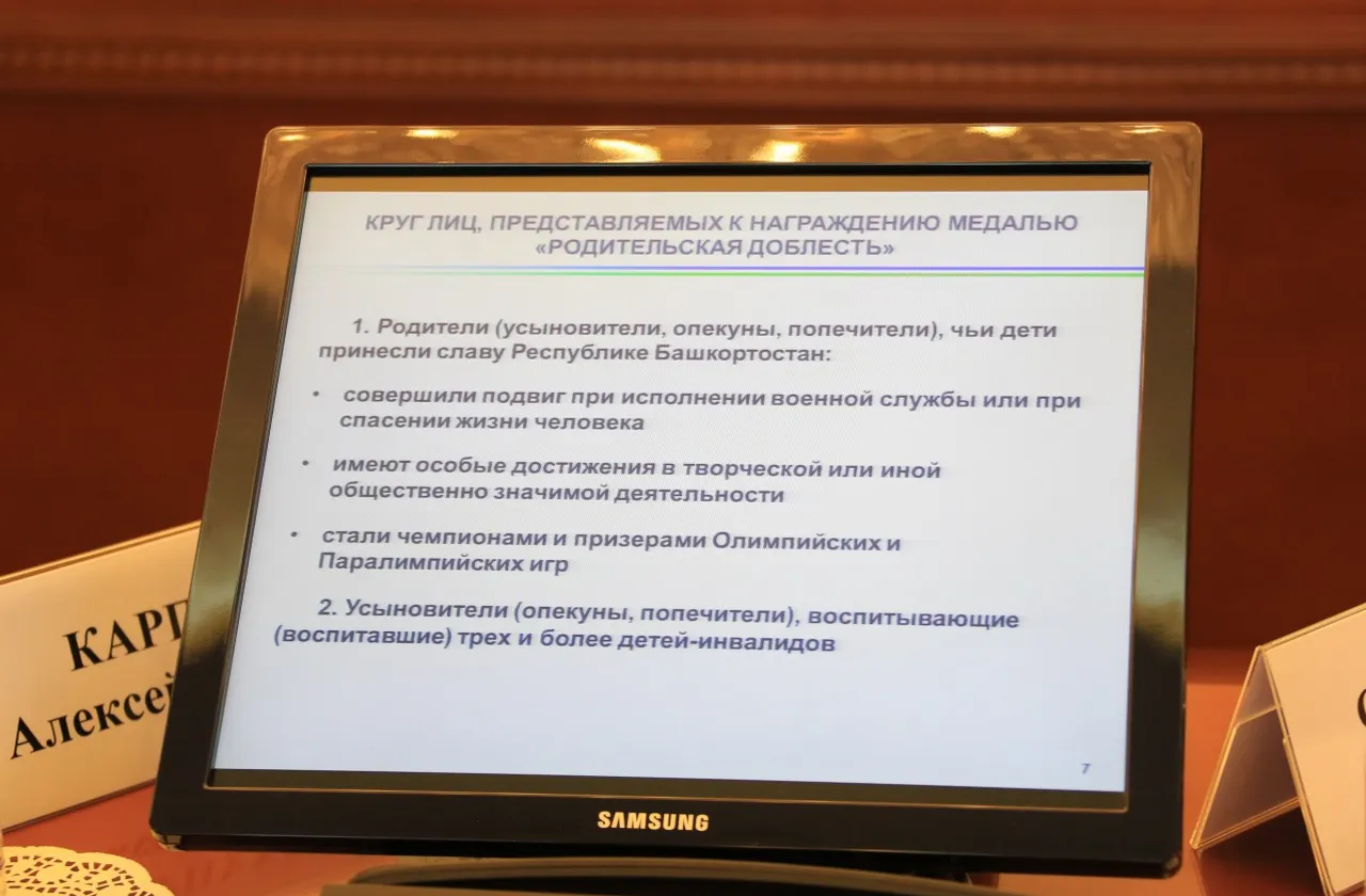 The bill provides for awarding the parents, who raised children, whose merits glorify Bashkortostan with the medal "For Parental Valour". Such achievements can be not only in sports, art, military service; heroic deeds in everyday life will be marked too.
